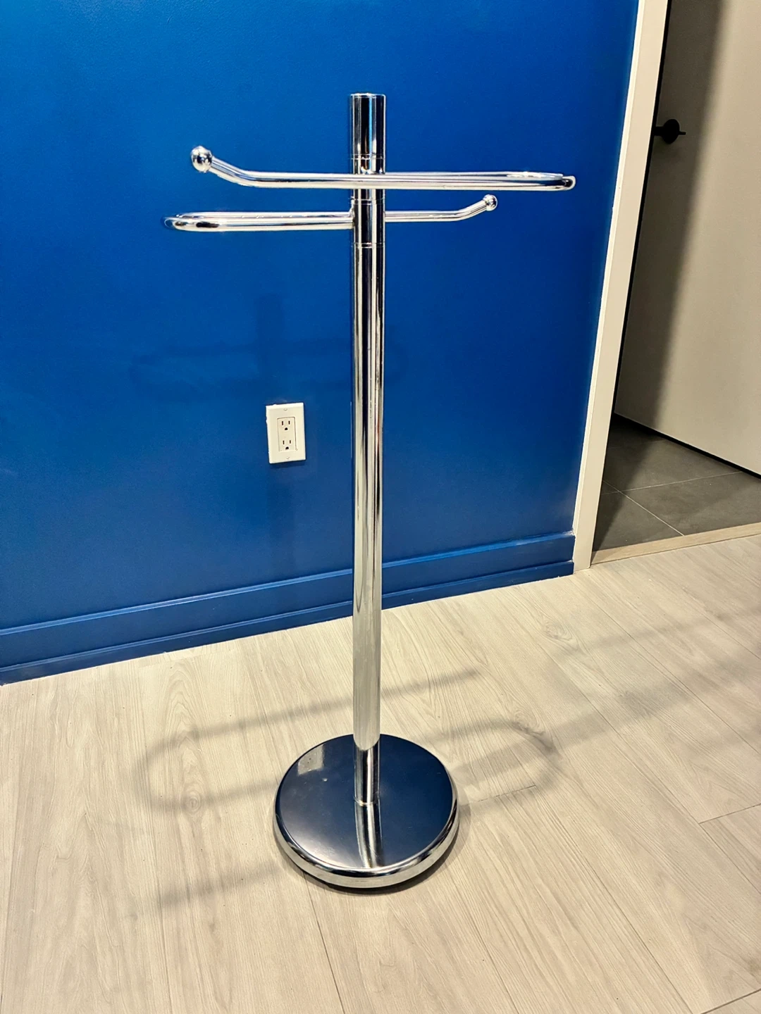 Here's a chrome towel rack stand in great condition! (Just a couple small cosmetic dings on the base). It has a weighted base and the racks can rotate. It's perfect for keeping your towels organized and adding a touch of modern style to your bathroom.
