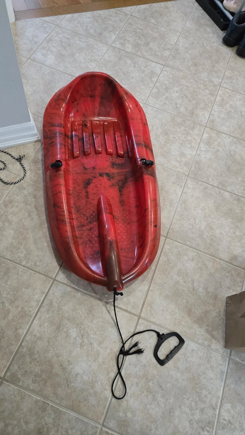 This red plastic toboggan sled is ready for winter fun! It features a marbled red and black design and comes with a rope and handle for easy pulling. Plastic construction ensures durability for snowy hills. Great for kids and adults to enjoy the snow!