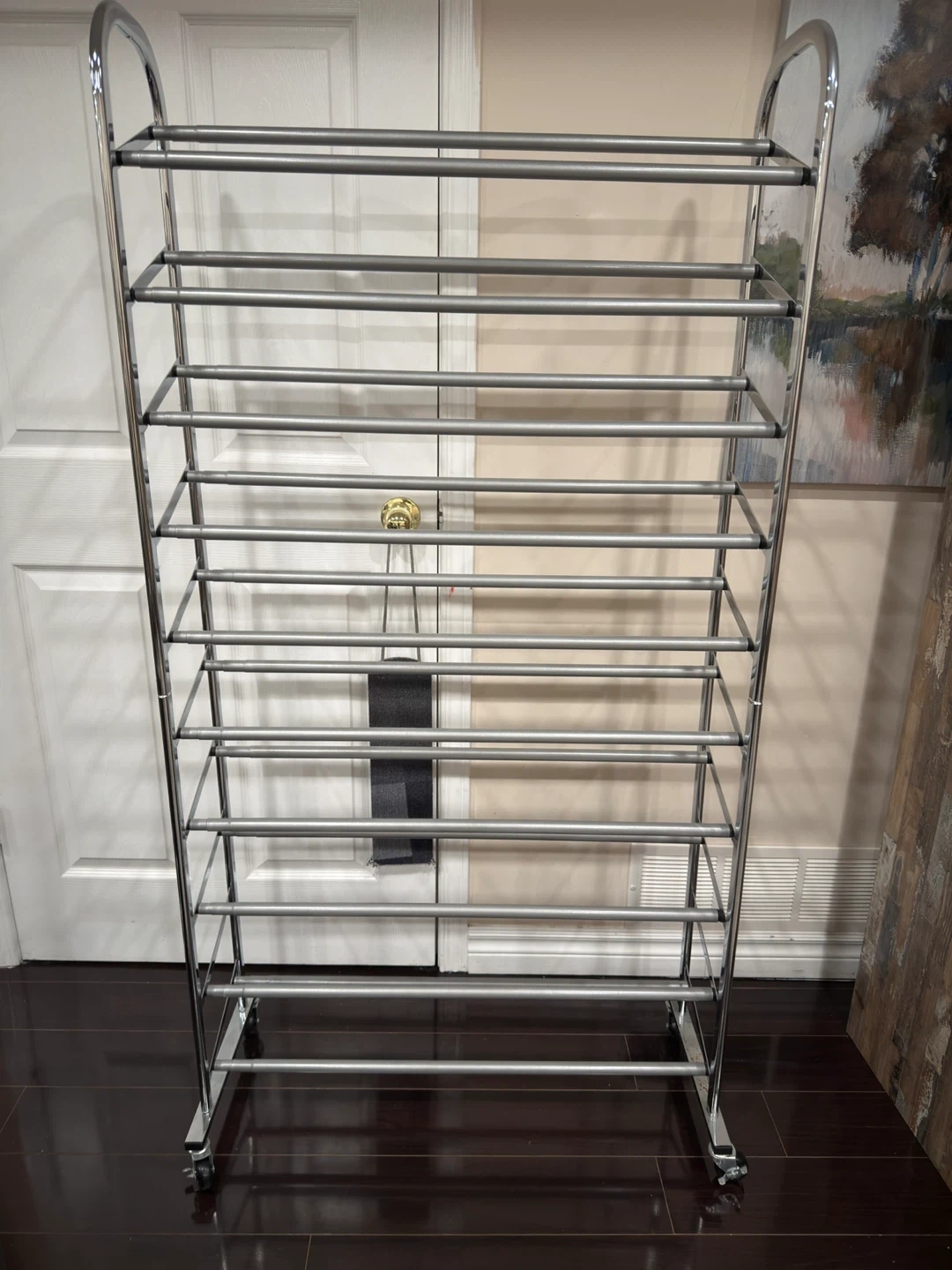This is a 10-tier shoe rack, perfect for organizing your footwear collection. It's made of durable metal and includes wheels for easy mobility. Keep your shoes tidy and accessible!