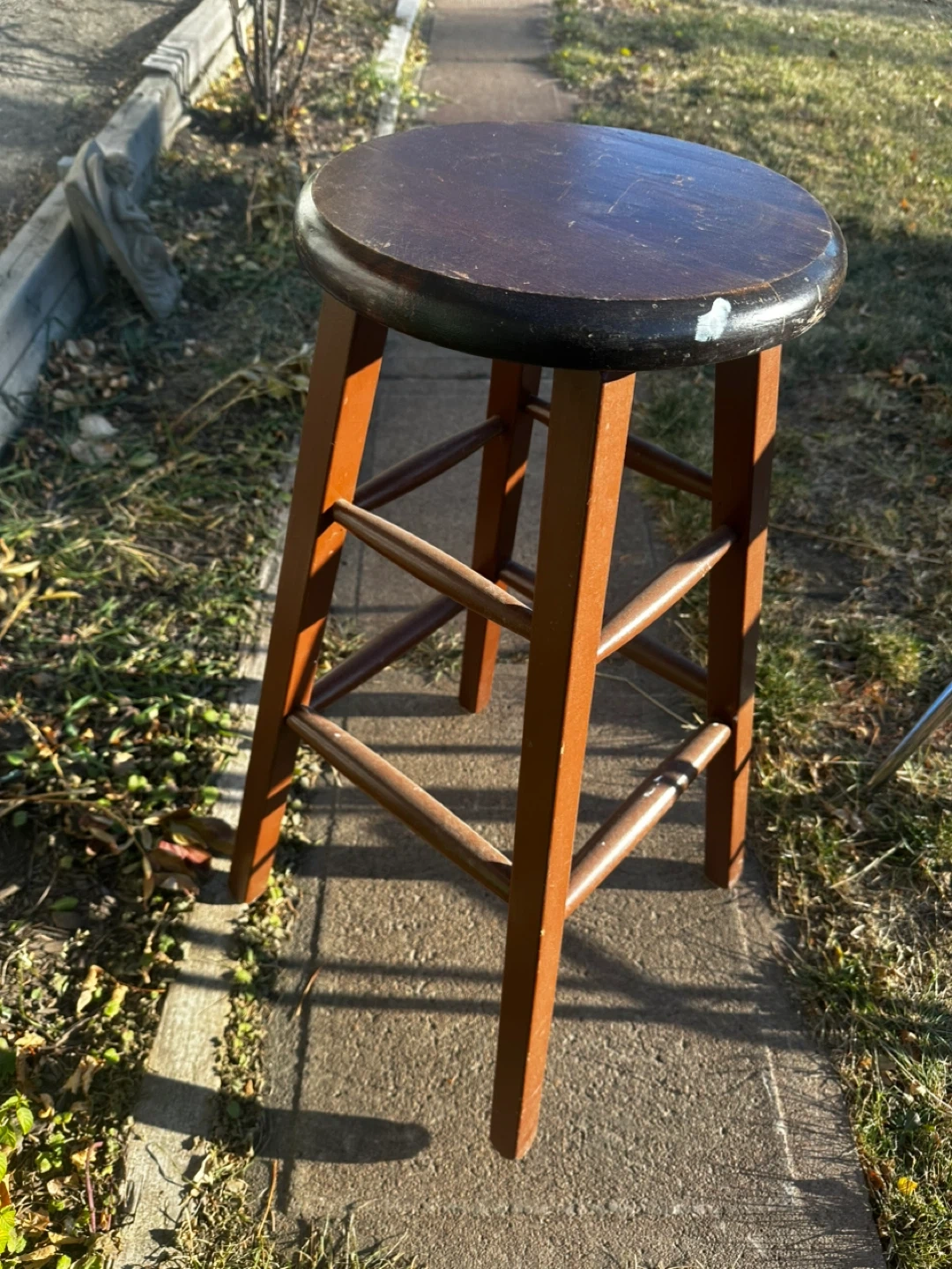 Selling 1 wooden bar stools in good condition. 29 inch tall. It has a round dark brown seat and a brown frame. Perfect for adding a rustic touch to your kitchen or bar area