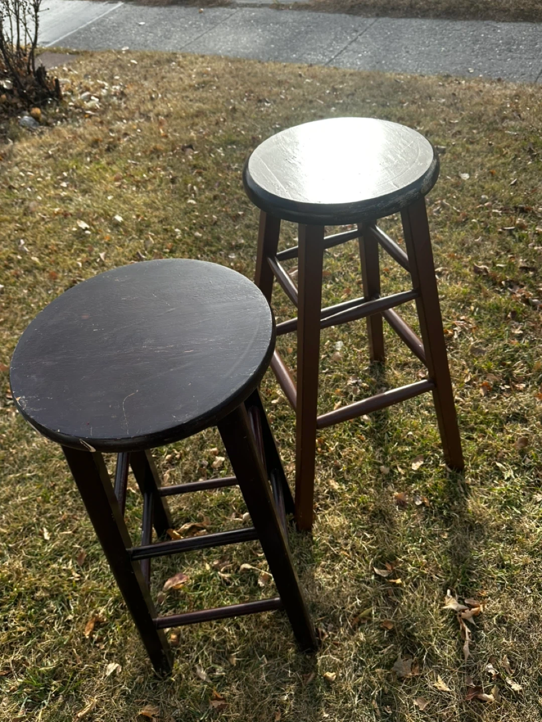 Selling 1 wooden bar stools in good condition. 29 inch tall. It has a round dark brown seat and a brown frame. Perfect for adding a rustic touch to your kitchen or bar area