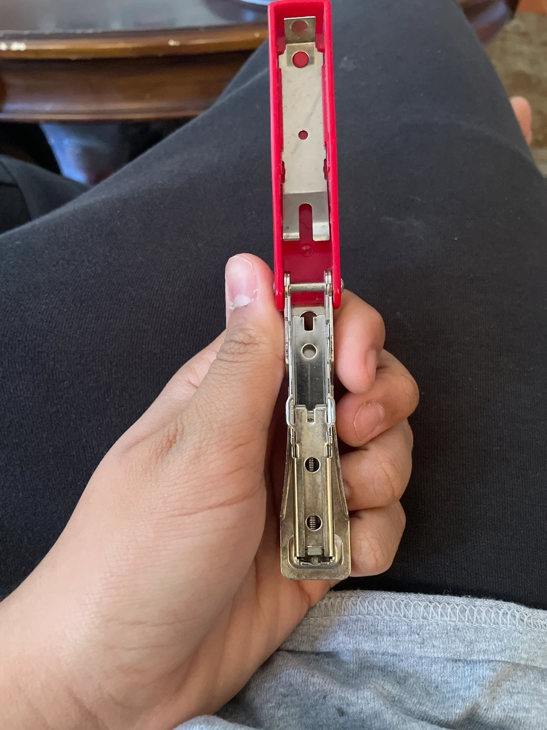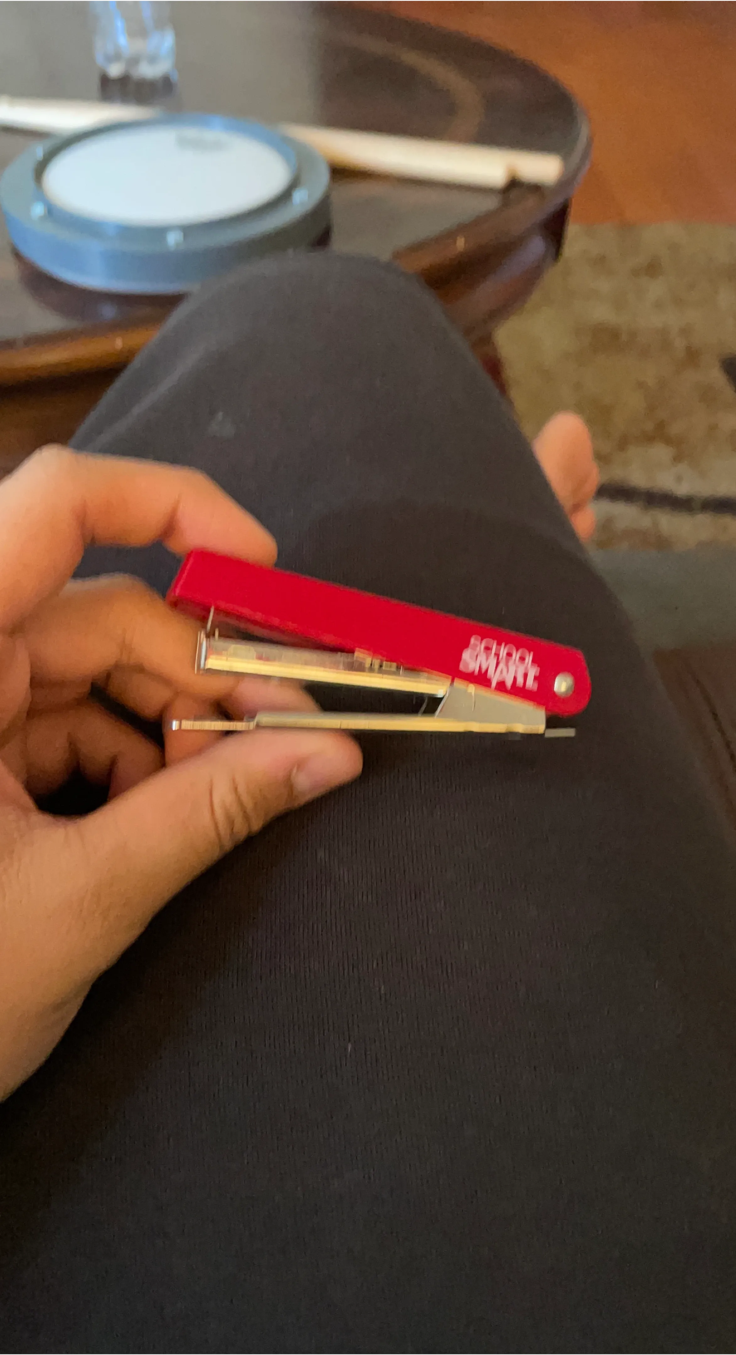 This is a compact red stapler with the 'School Smart' logo. It's made of metal and plastic for durability. This mini stapler is useful for on-the-go stapling needs.