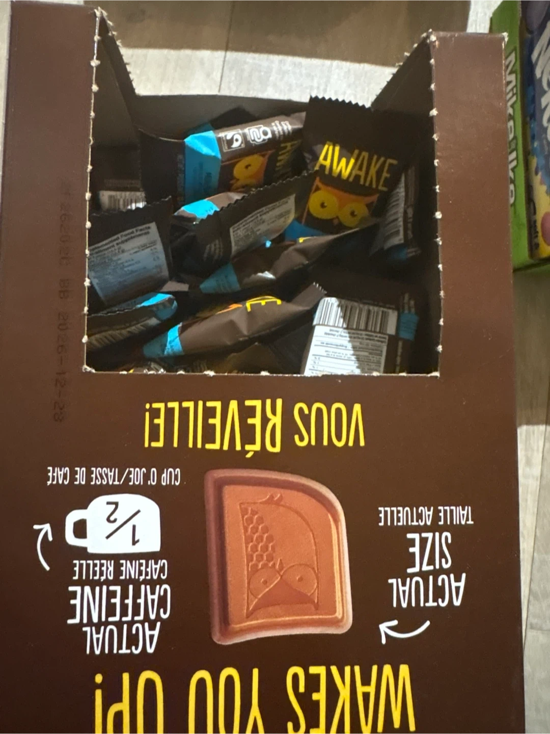 These AWAKE caffeine bars are designed to wake you up. Each bar contains the caffeine equivalent of a cup of coffee. They're individually wrapped for convenience.