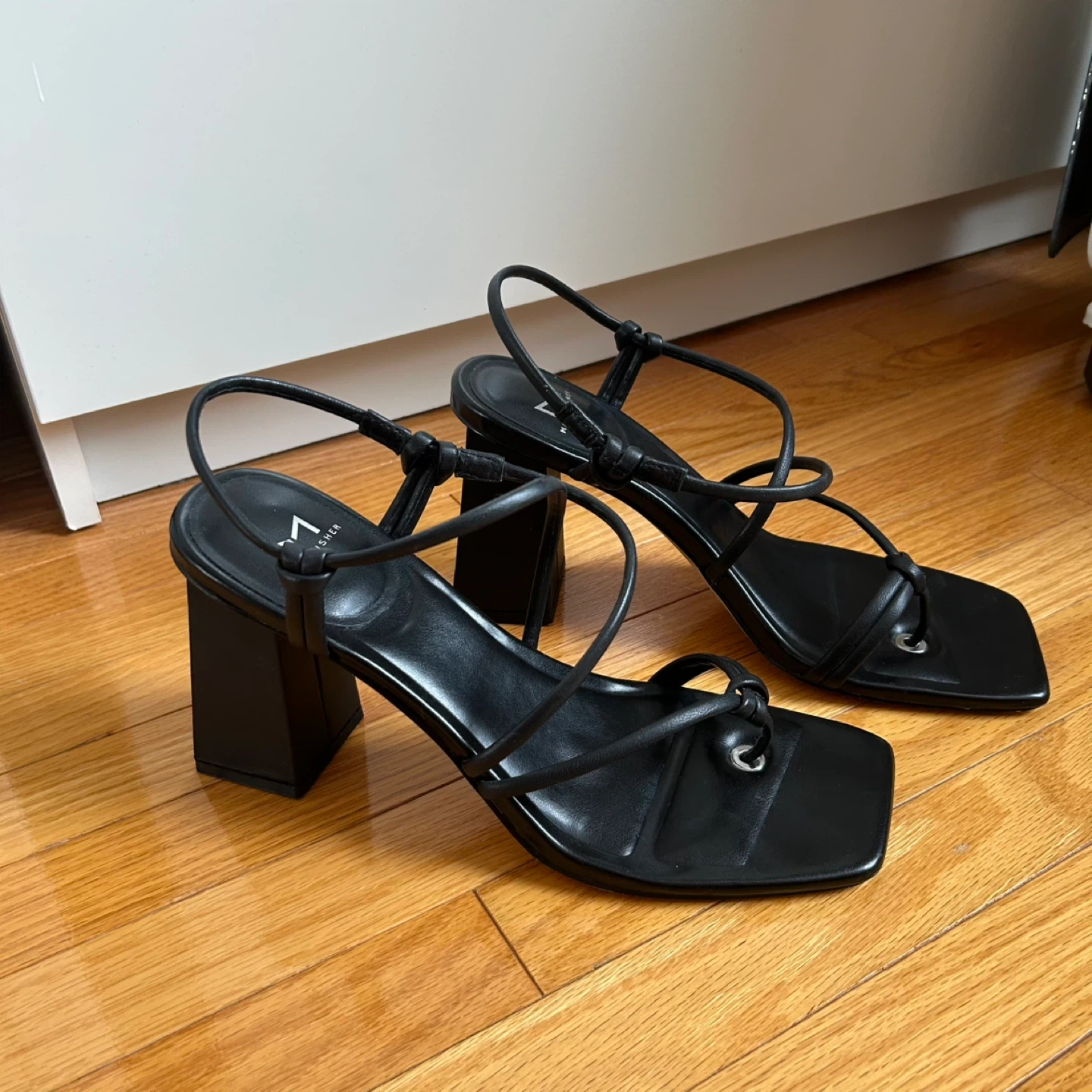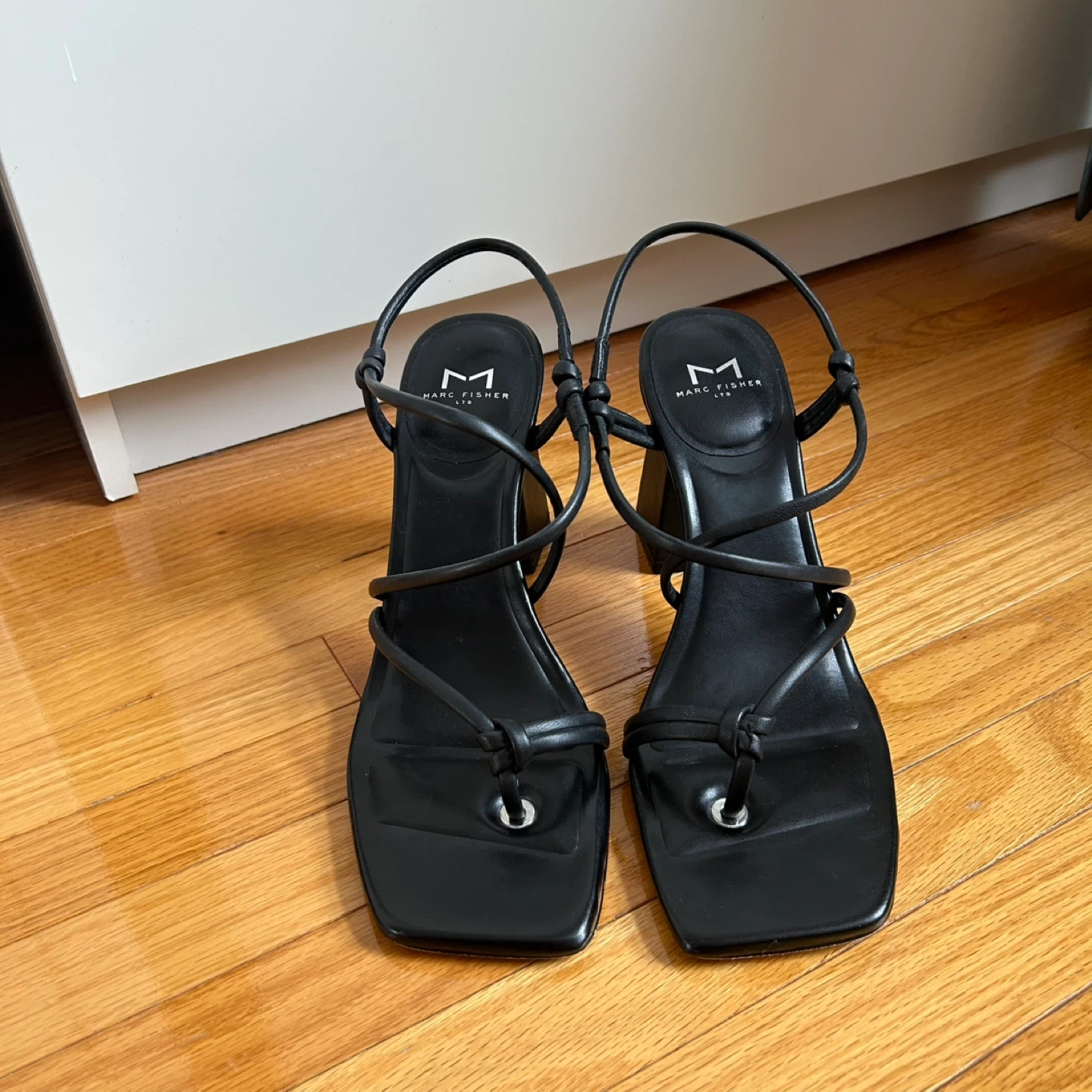 Marc Fisher black sandals with a strappy design. Features a square toe and a chunky block heel. Great for dressing up any outfit!