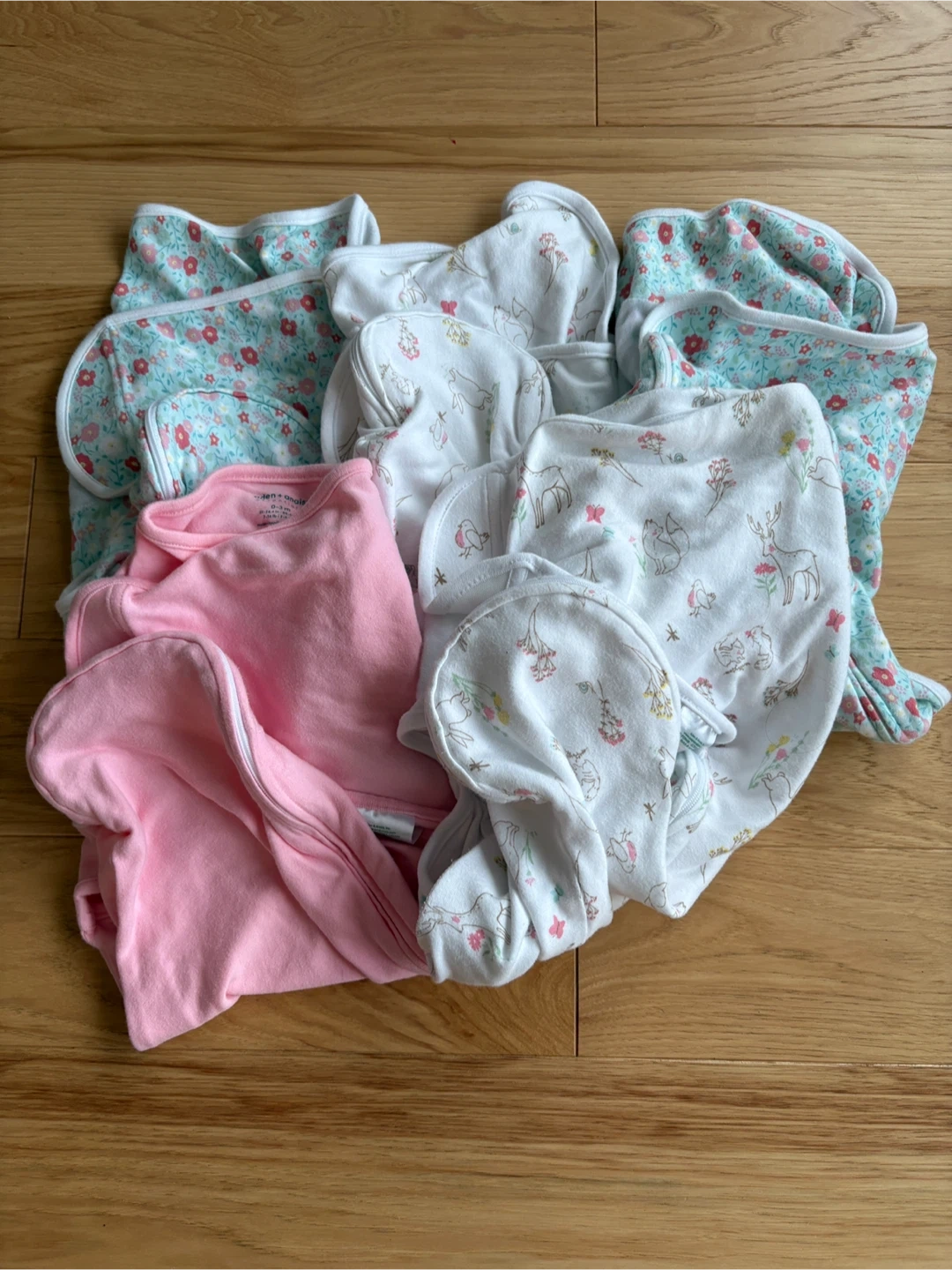 A bundle of baby sleep essentials! Includes Aden + Anais swaddles in cute prints and a pink sleepsack, size 0-3 months. Perfect for keeping your little one cozy and secure during sleep time