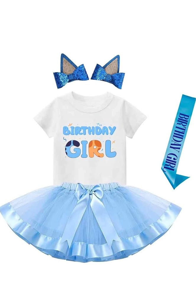 Adorable Bluey Birthday Girl Outfit for 3-year-old - Includes dog ears, birthday t-shirt, tutu dress, and satin sash.