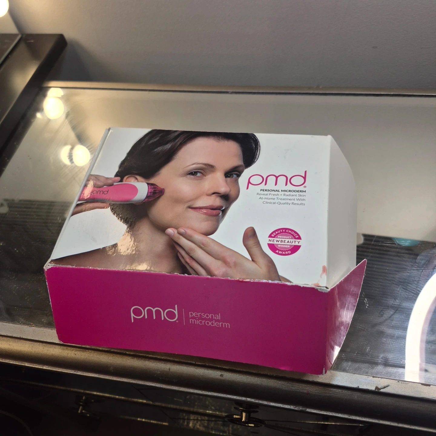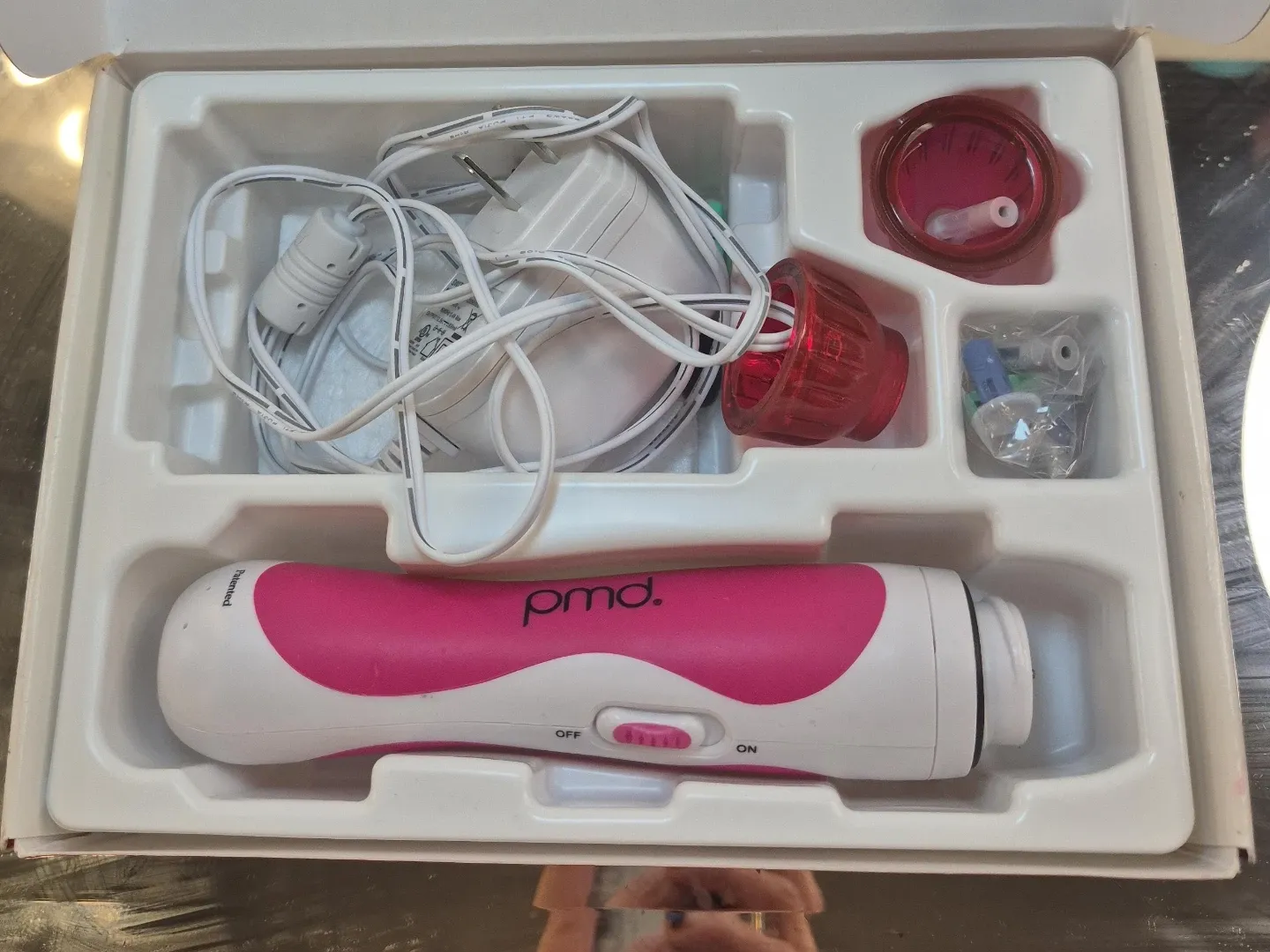 This PMD Personal Microderm device is designed to revitalize and refresh your skin. It comes with various attachments and a charging cord. It's pink and white.