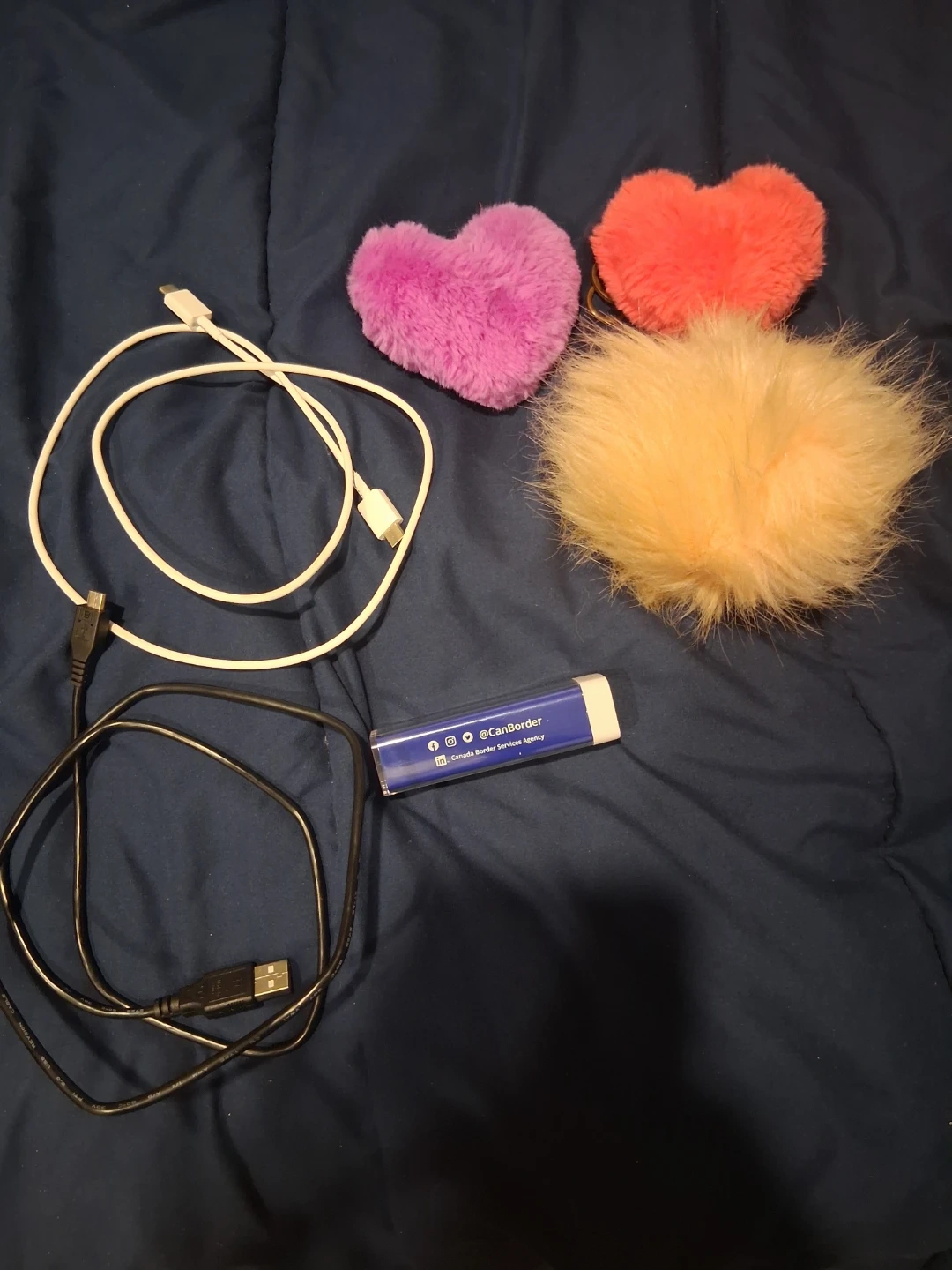 Comes with three fluffy heart-shaped charms in purple, pink, and yellow. Also includes two USB cables, one white and one black. A blue cylinder with Canada Border Services Agency branding is included.