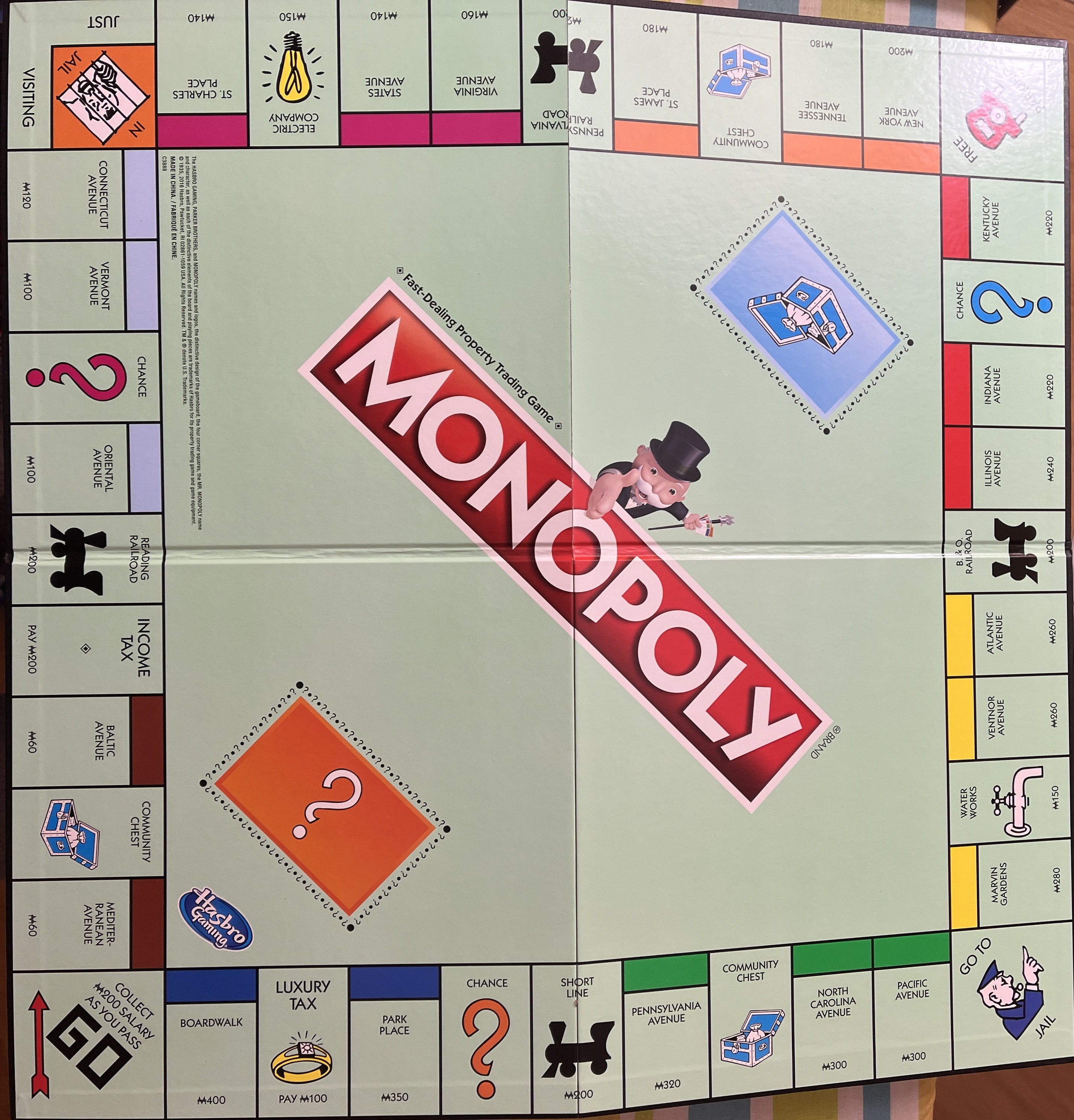 Selling a Monopoly board game! It's the fast-dealing property trading game. Comes with the gameboard, title deed cards, chance and community chest cards, houses, hotels, dice, and money pack. Great for family game night!