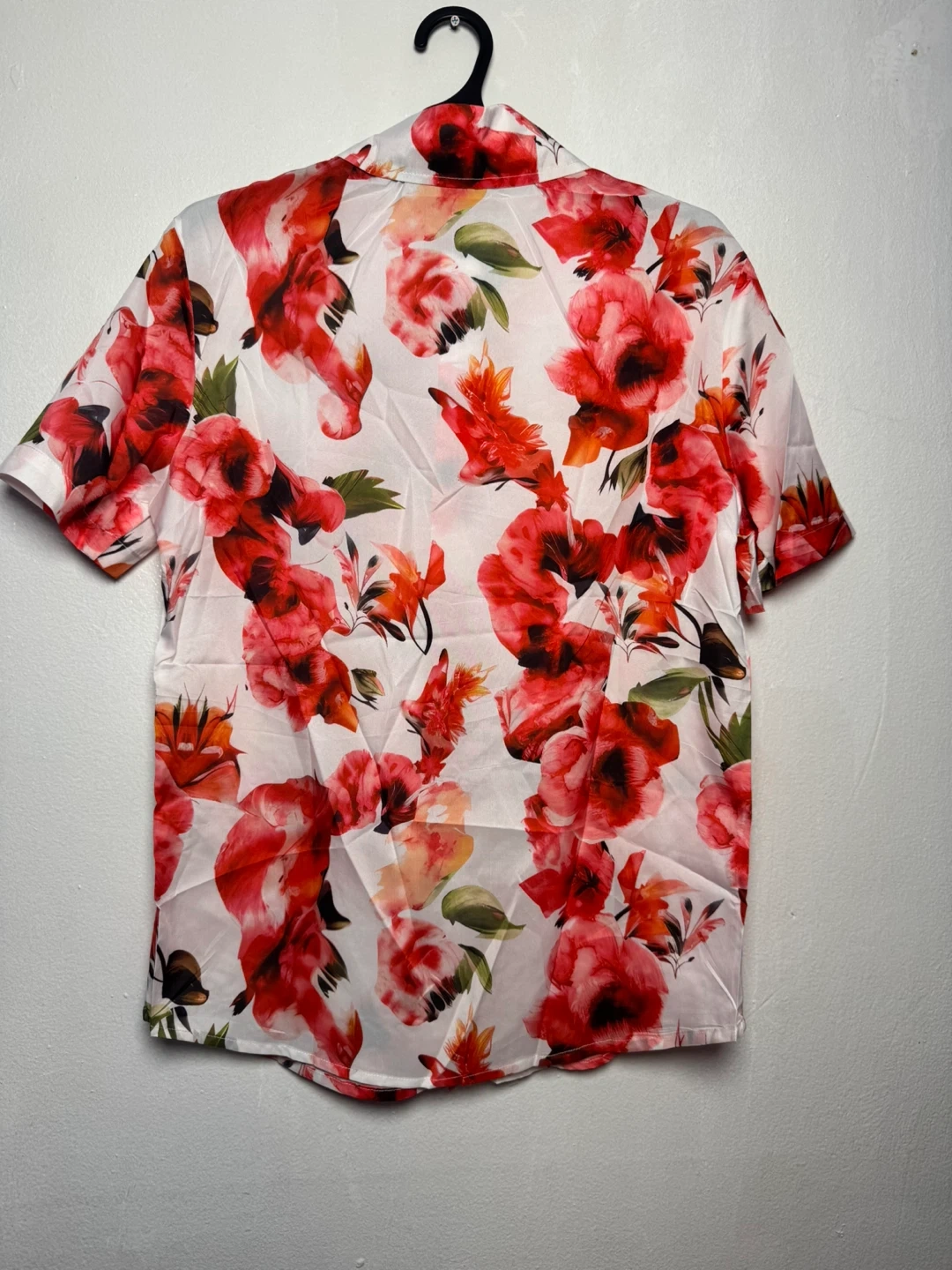 This short sleeve button-up shirt features a vibrant red floral print. It's a size small with a classic collar and a chest pocket. Polyester material.