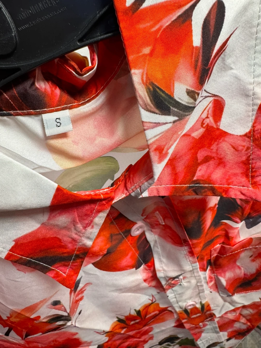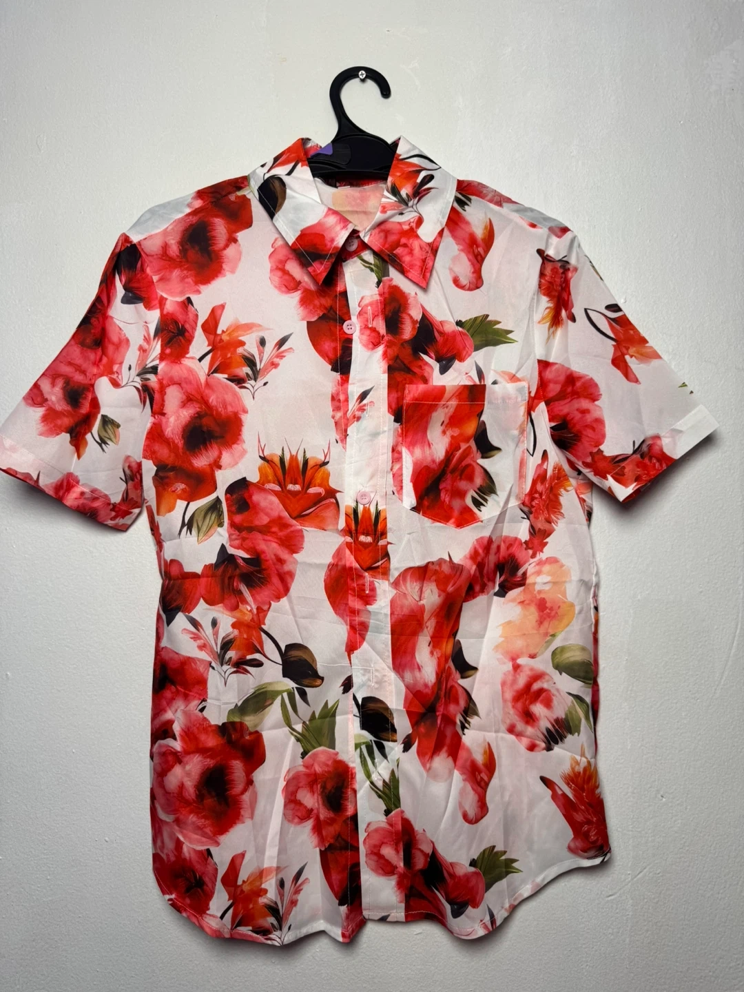 This short sleeve button-up shirt features a vibrant red floral print. It's a size small with a classic collar and a chest pocket. Polyester material.