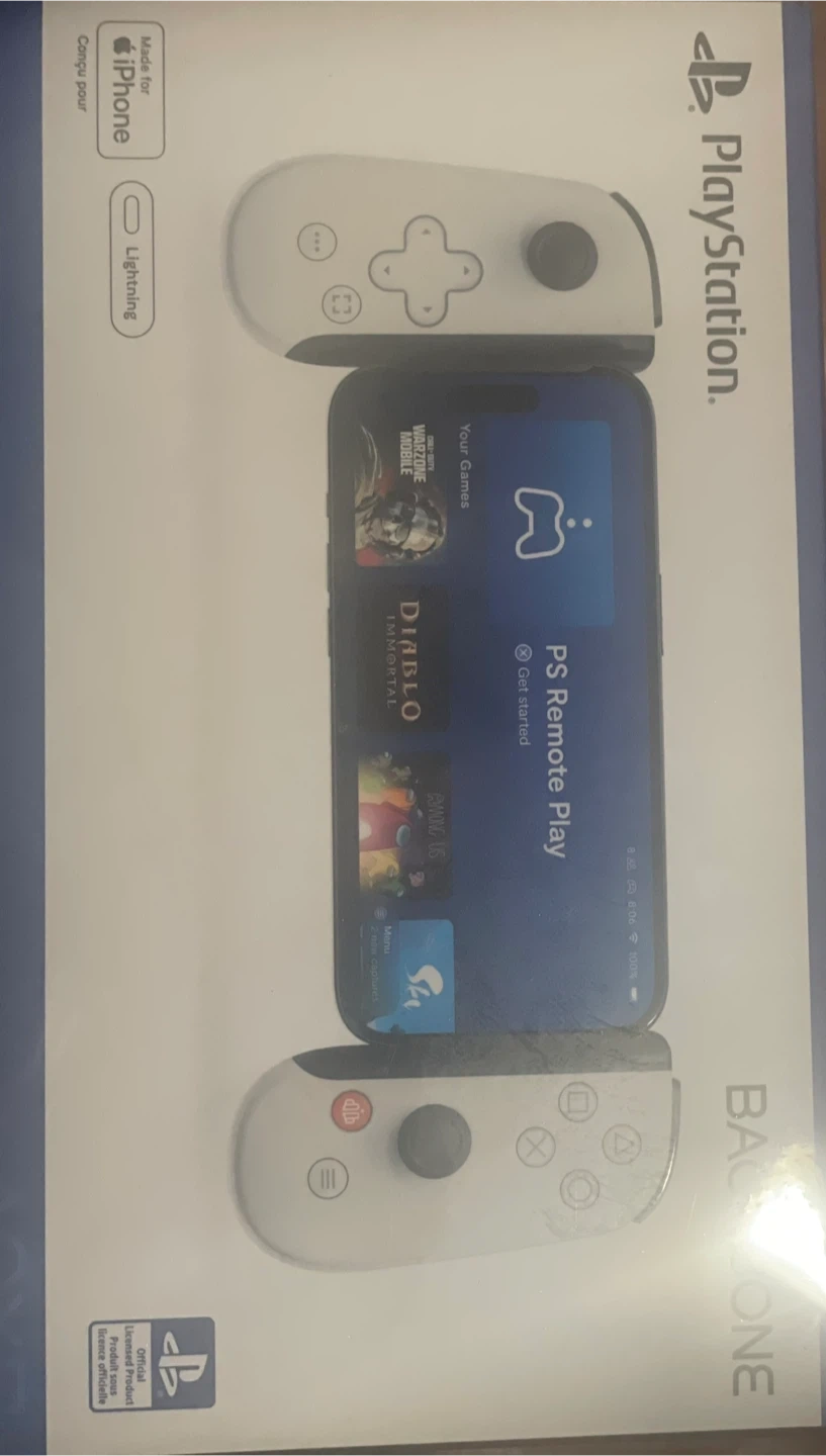 This is a Backbone One controller designed for iPhone. It's officially licensed by PlayStation. It connects via Lightning for gaming on your phone.