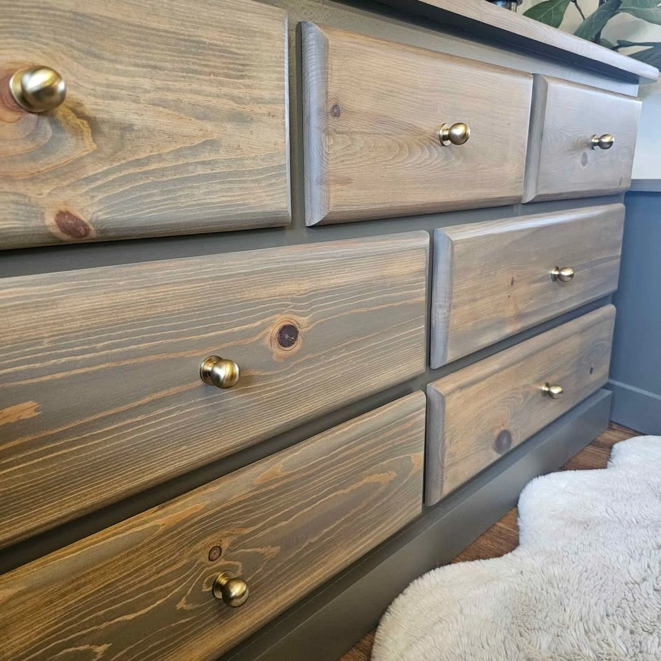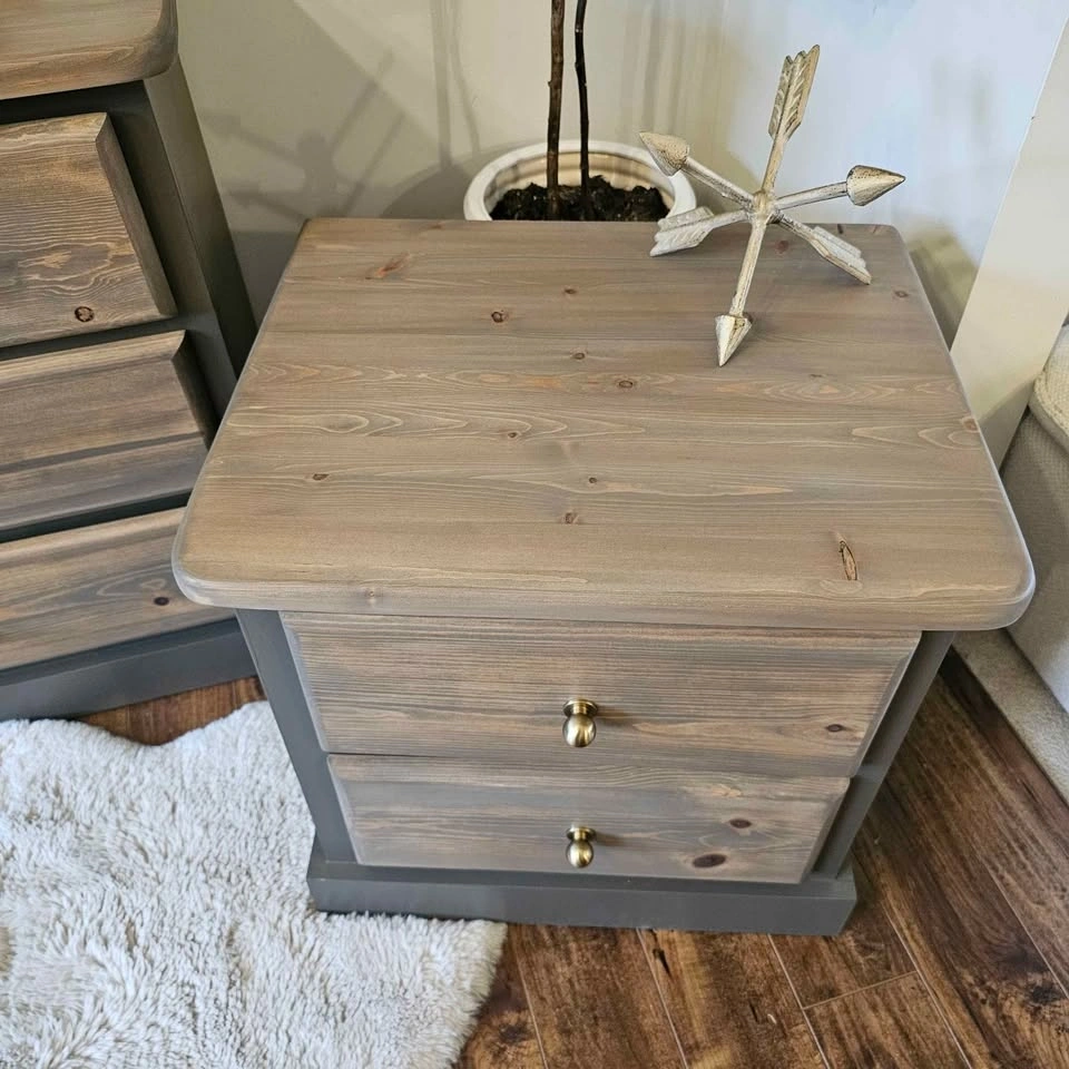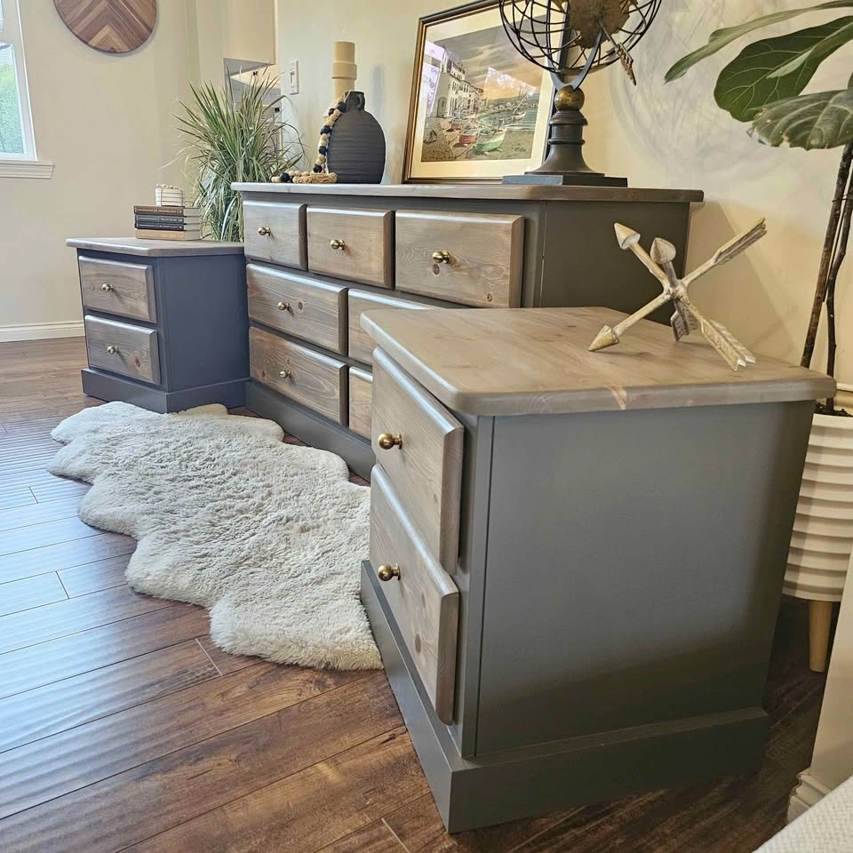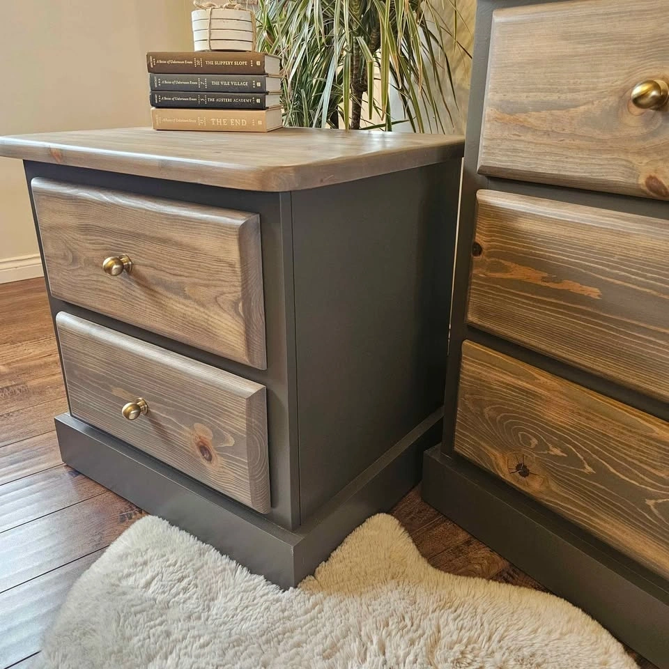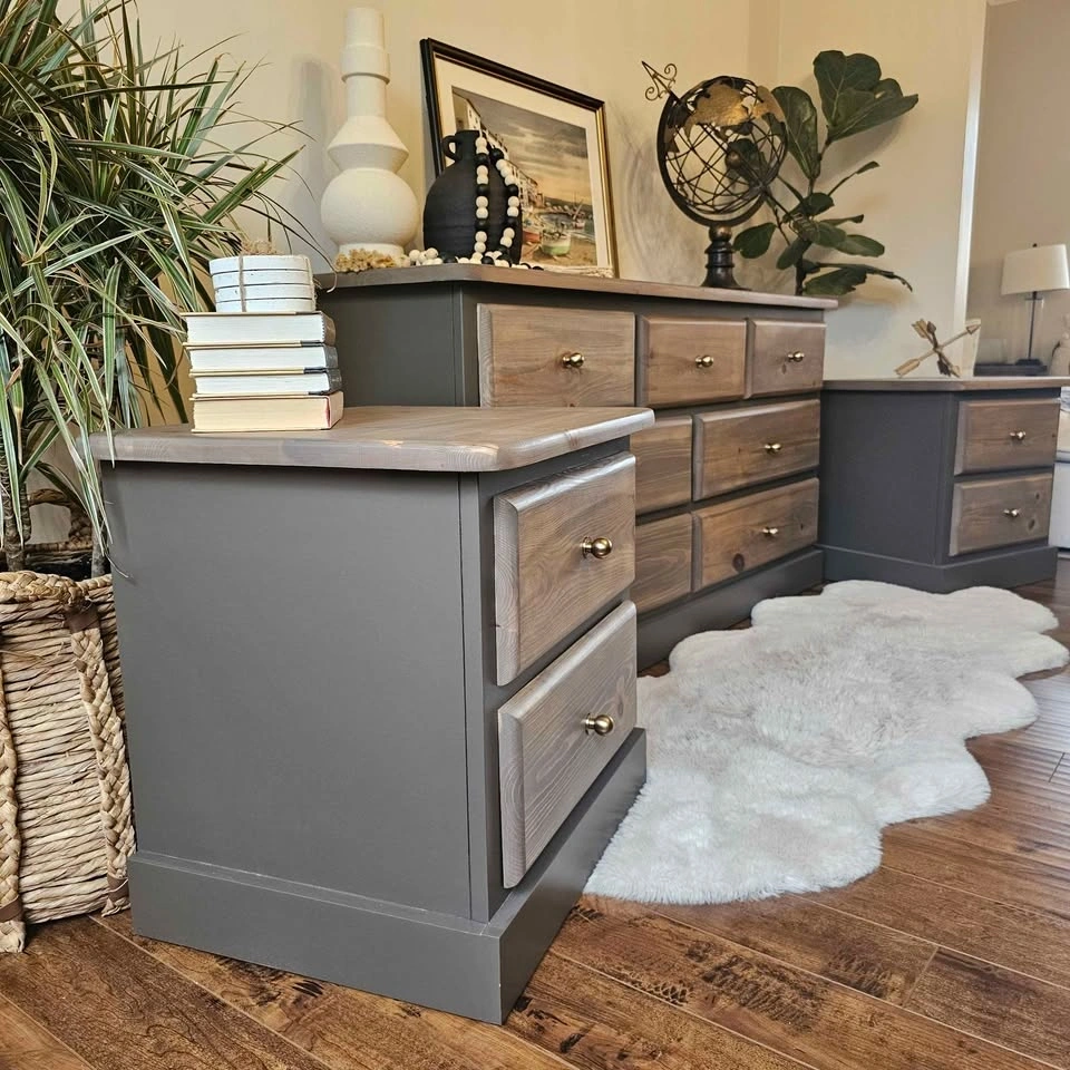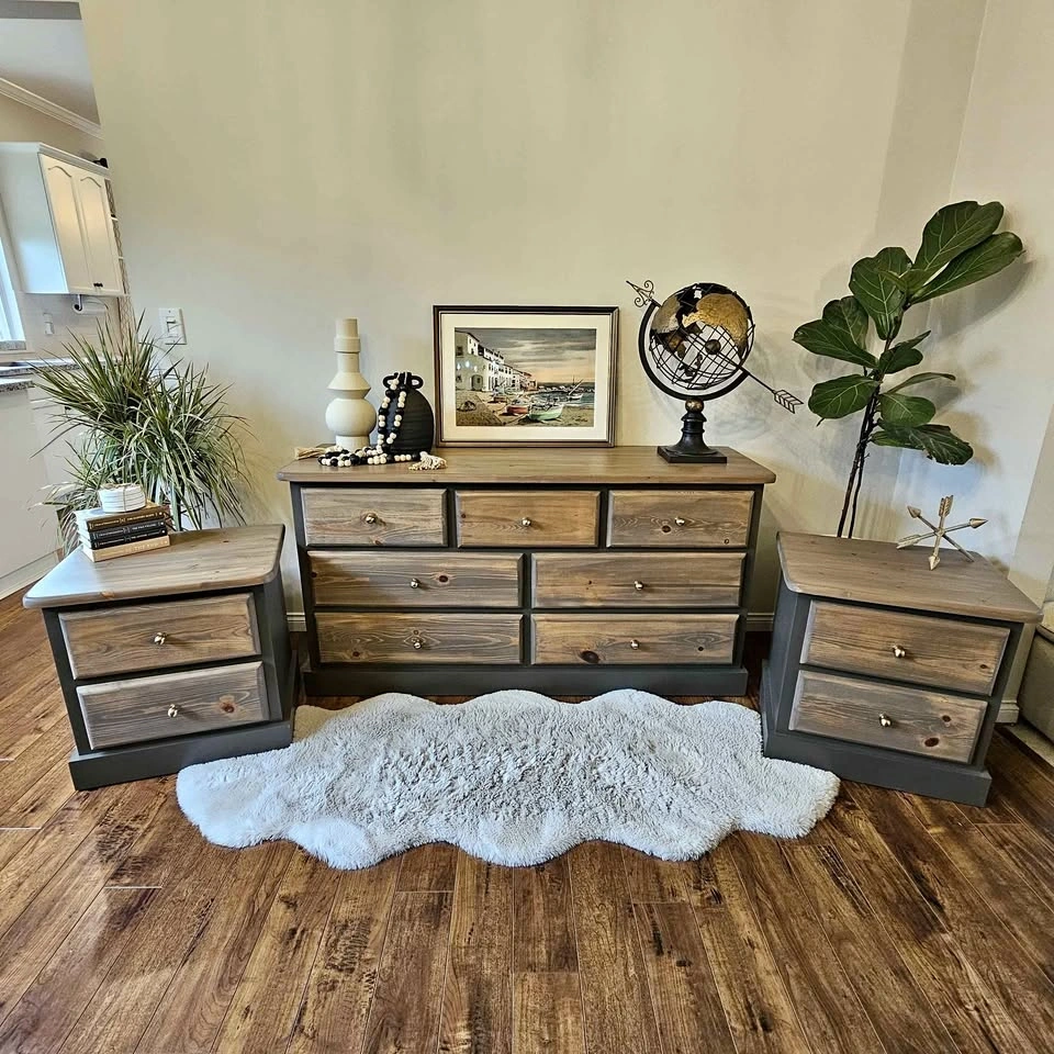 Refinished solid pine wood dresser and 2 night tables set. Painted in Benjamin Moore's cabinetry paint in the colour Willow (Benjamin Moore's description: Like the silhouette of a willow tree in the evening, this darkened brown is dramatic and full of beguiling mystery). This colour is super neutral and gives all the outdoor feels. Brown with hints of green and Grey and even purple in some lights. Painted with a sprayer for a super smooth finish.