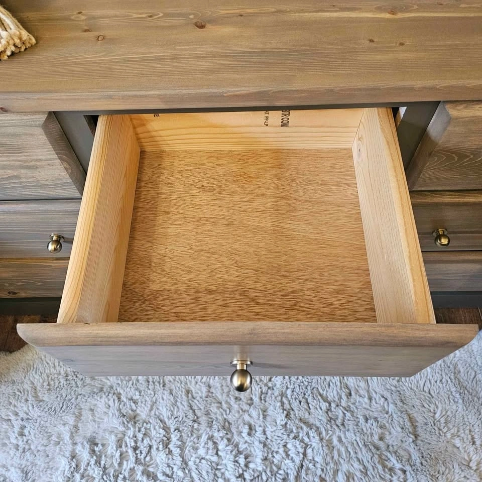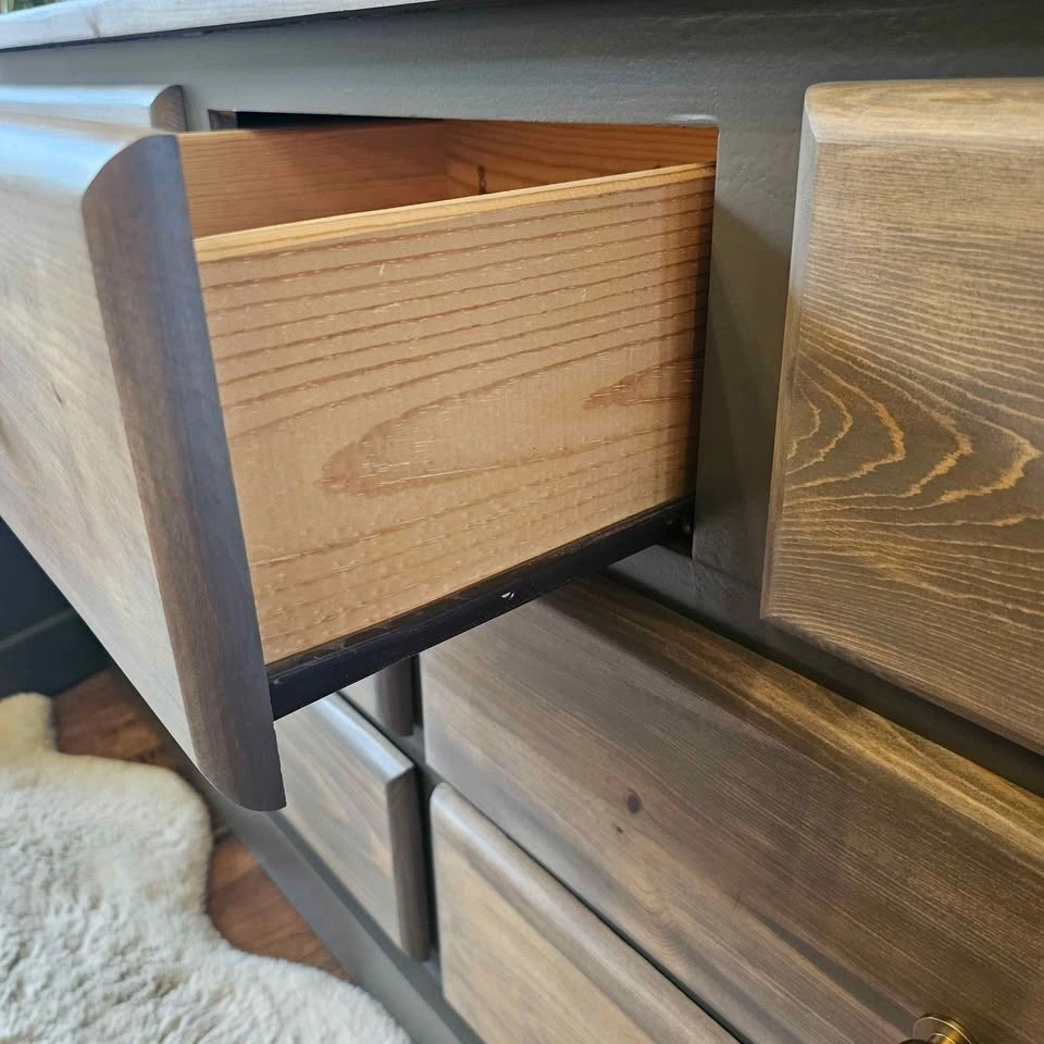 The drawers are all on rollers and open and close smoothly. Super thick drawers that will last a long time. Brand new champagne bronze knobs have also been added.