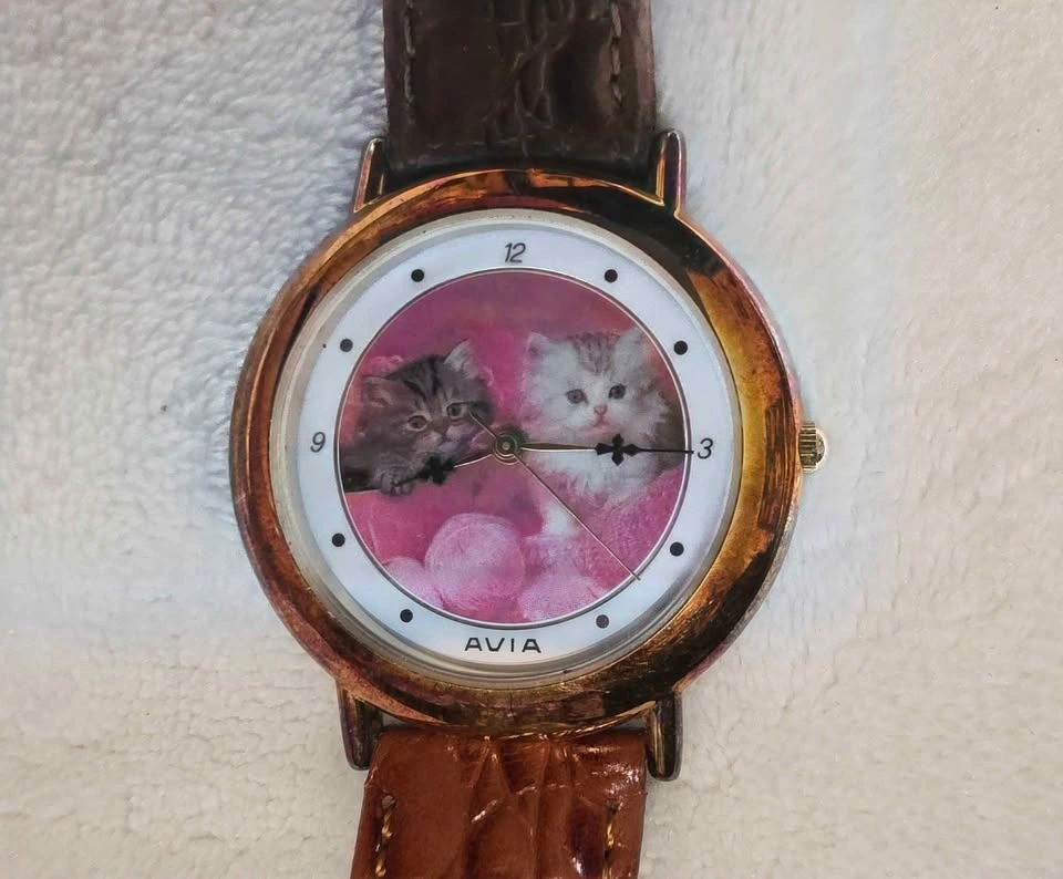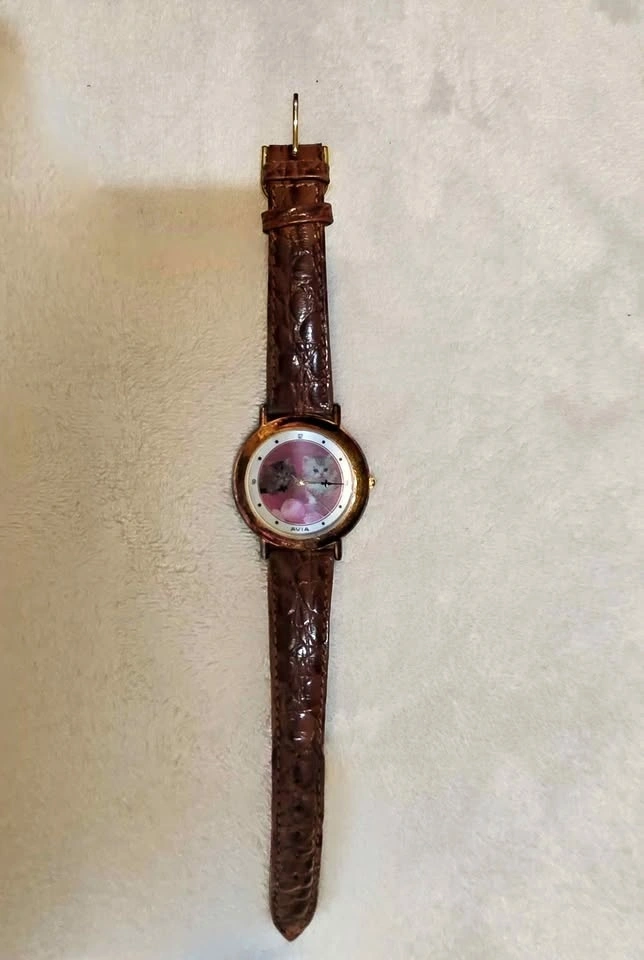 This watch features a leather band and a clock face with a cute kitten design, showing two cats playing with yarn. It needs a new battery. Japan Movt stainless steel.