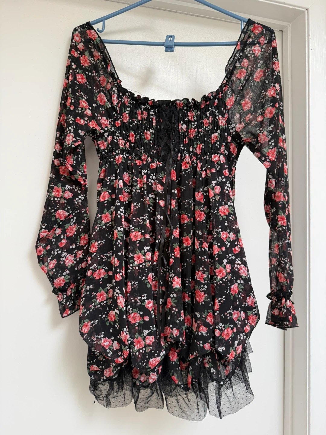 Cute floral print dress/top in a black and red colour scheme. It features long sleeves and a lace-up front design. Perfect for a night out or a special occasion!