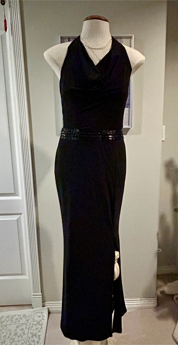 A classic black halter maxi dress from Laundry by Shelli Segal. It features a cowl neckline and a beaded waistband accent. This dress is size 4 and designed in Los Angeles.