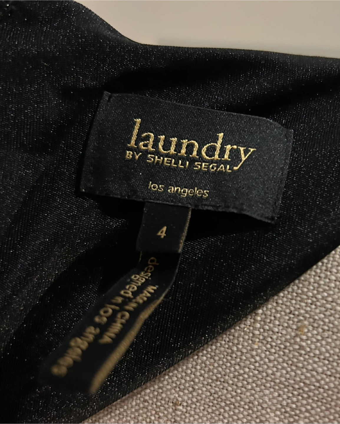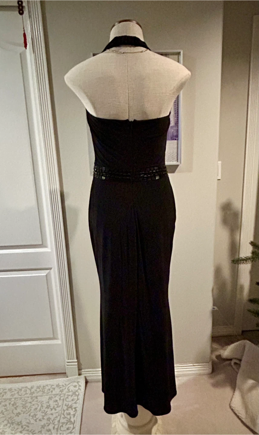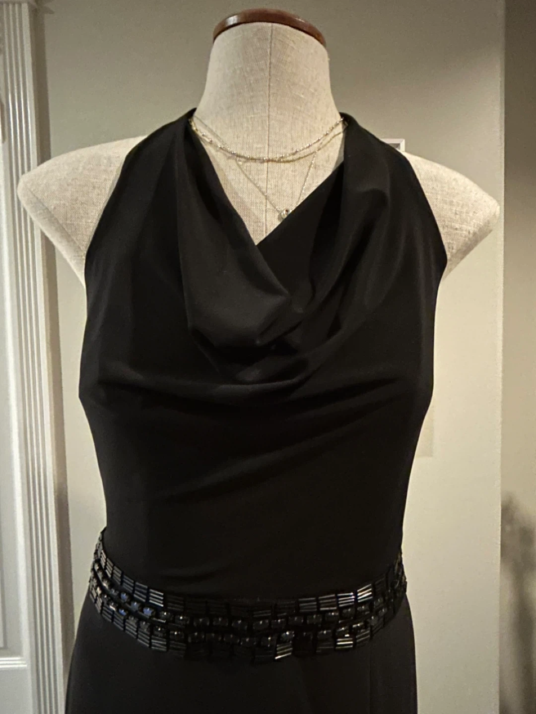 A classic black halter maxi dress from Laundry by Shelli Segal. It features a cowl neckline and a beaded waistband accent. This dress is size 4 and designed in Los Angeles.
