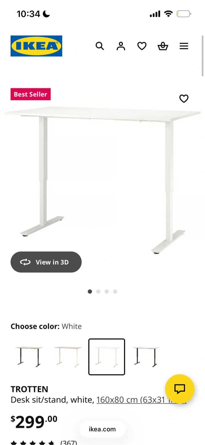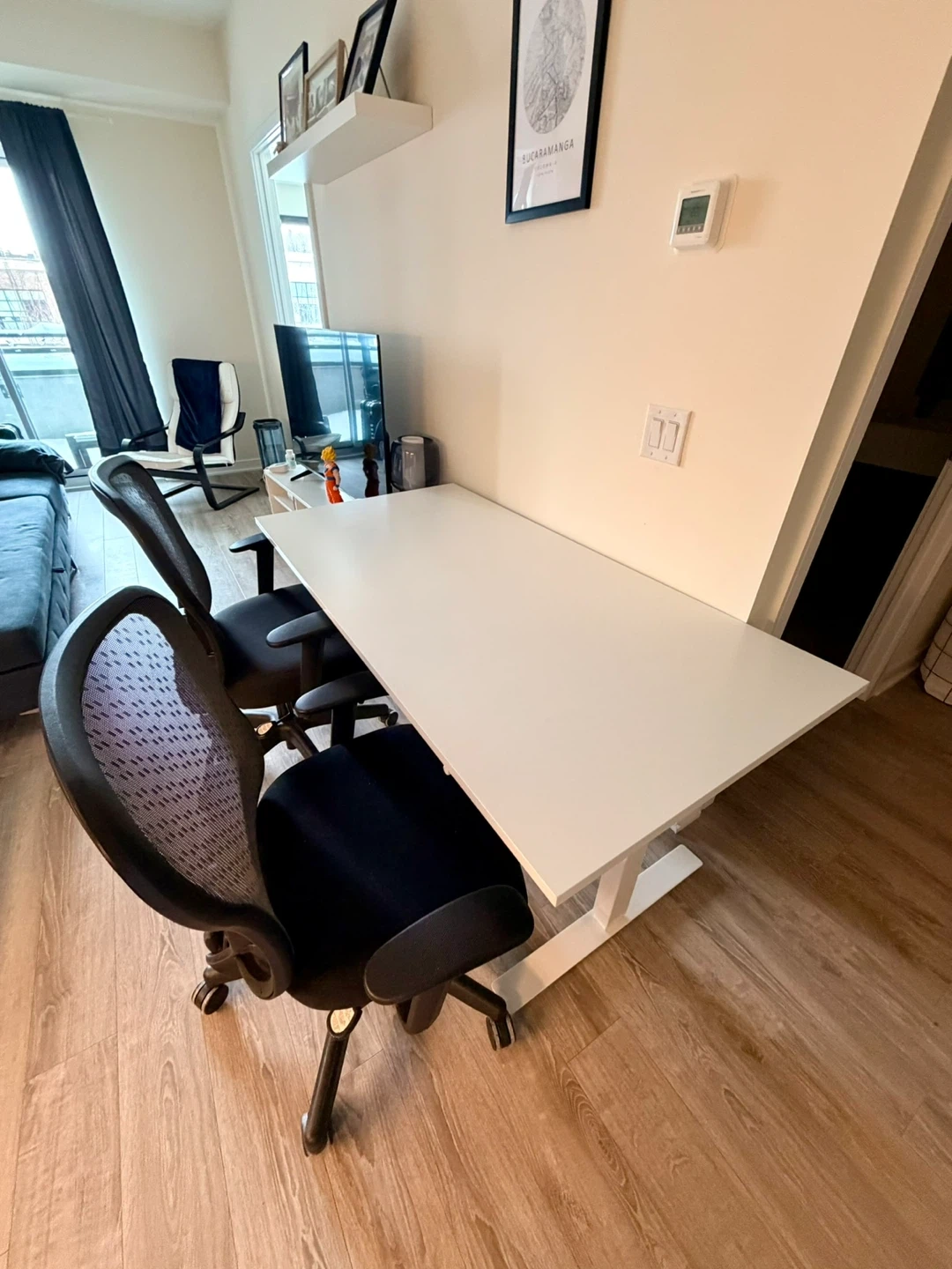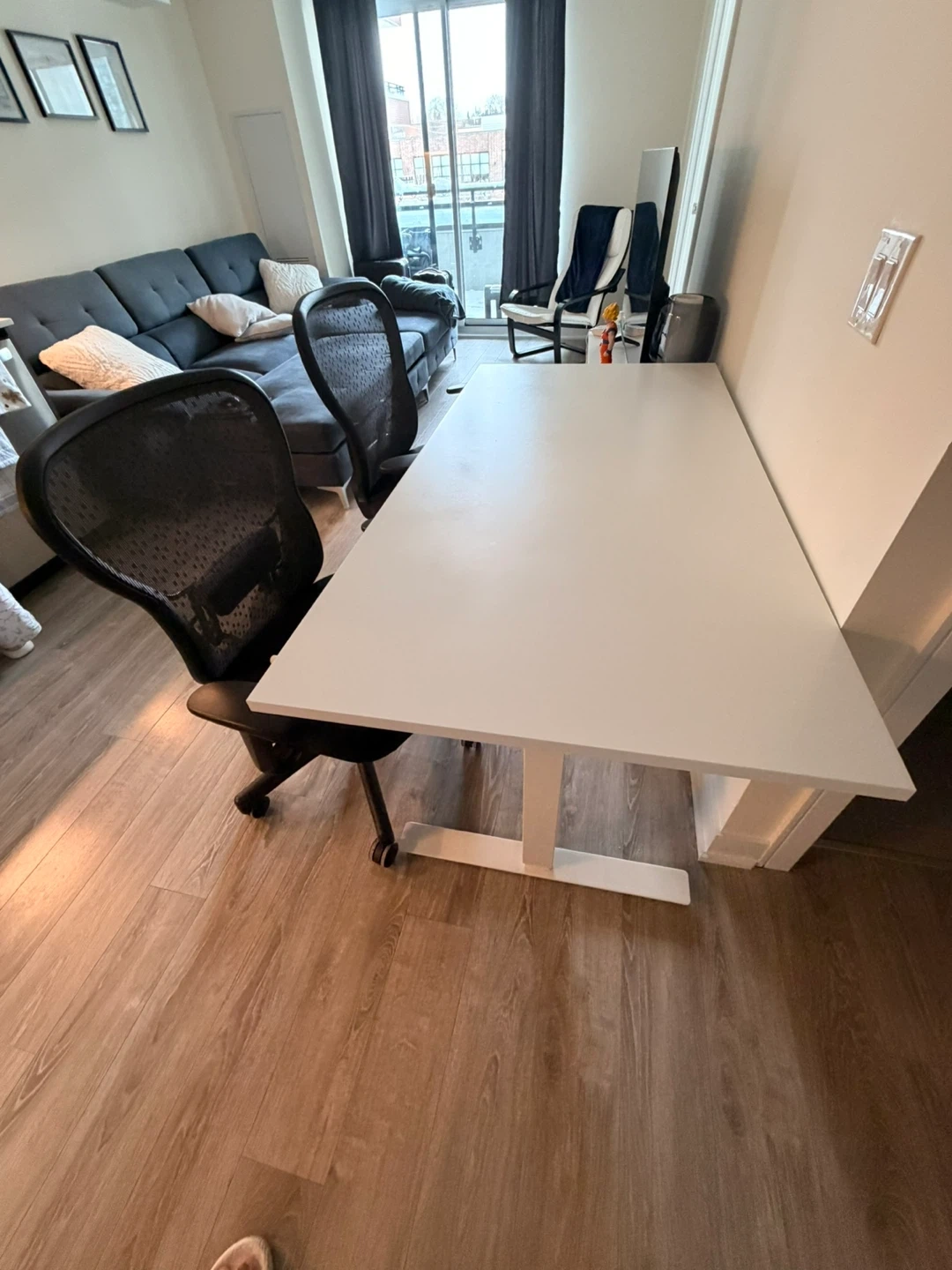 This is the IKEA Trotten desk in white. It's a sit/stand desk with a surface measuring 160 cm by 80 cm. The height is adjustable, ranging from 70 cm to 120 cm. It's great for creating a flexible workspace! 130 OBO. Pick up south etobicoke