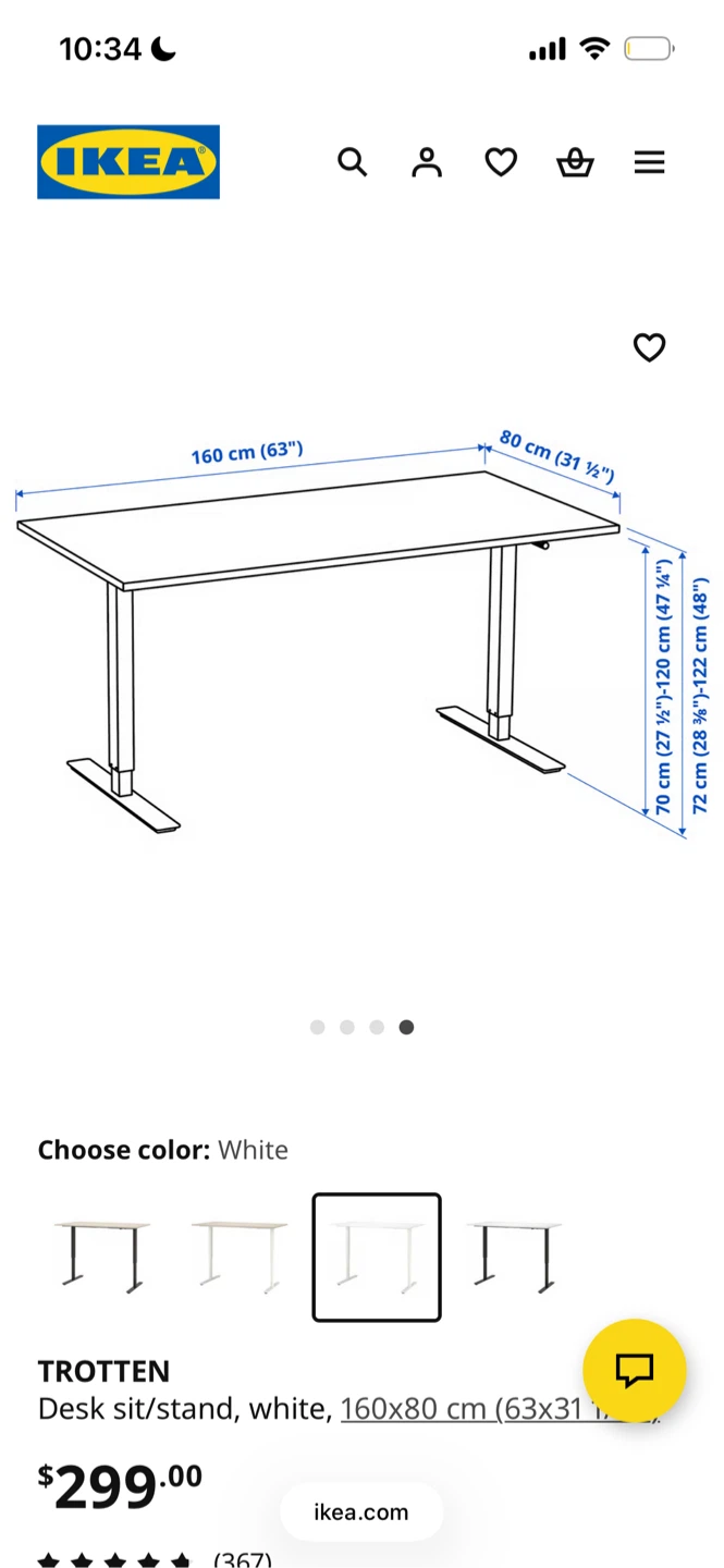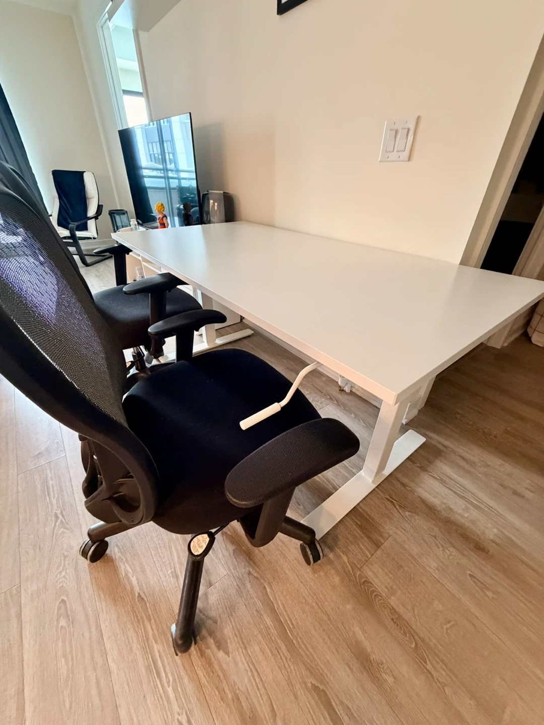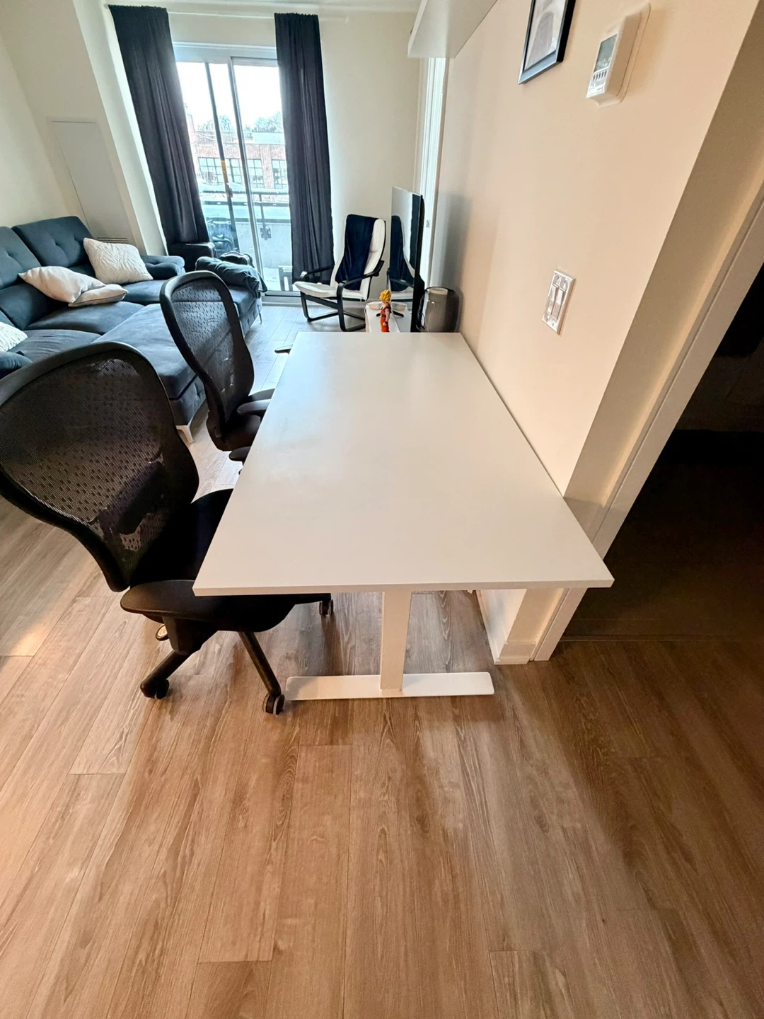This is the IKEA Trotten desk in white. It's a sit/stand desk with a surface measuring 160 cm by 80 cm. The height is adjustable, ranging from 70 cm to 120 cm. It's great for creating a flexible workspace! 130 OBO. Pick up south etobicoke