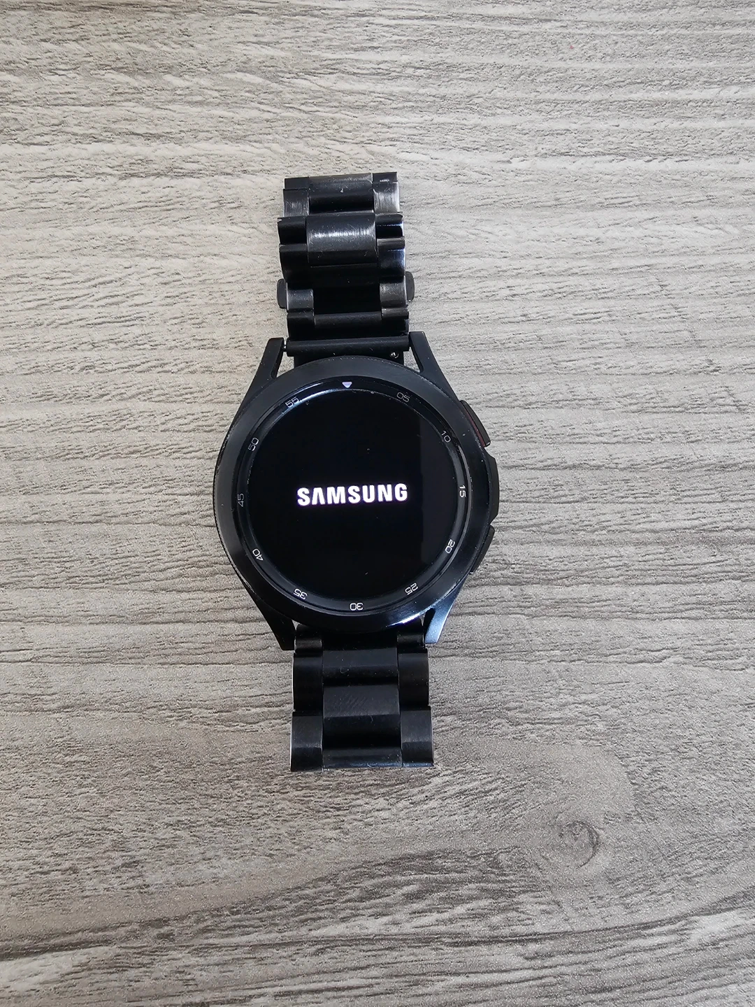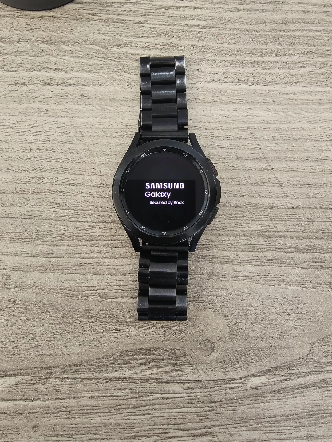 Black Samsung Galaxy smartwatch with metal band. Functions include time and date display. Secured by Knox.