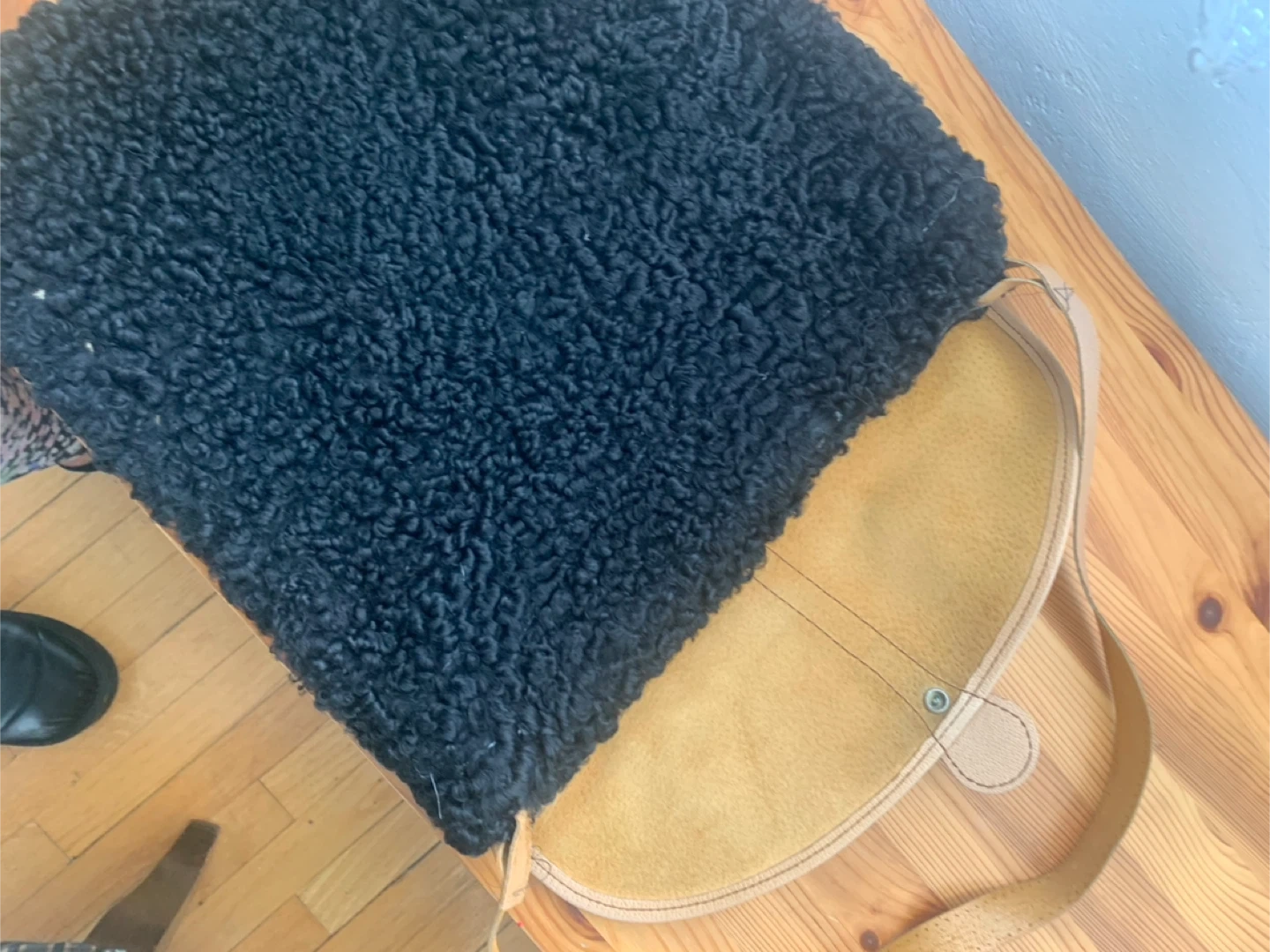 This is a unique hand made shoulder bag made of Persian lamb fur front and tan leather flap and strap. It's secured with a decorative button closure. The strap is adjustable for comfortable wear. This bag is great for adding a statement piece to any outfit!