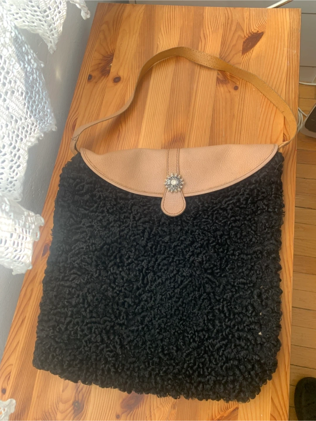 This is a unique hand made shoulder bag made of Persian lamb fur front and tan leather flap and strap. It's secured with a decorative button closure. The strap is adjustable for comfortable wear. This bag is great for adding a statement piece to any outfit!