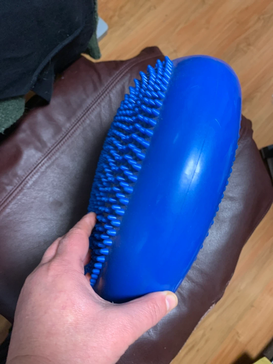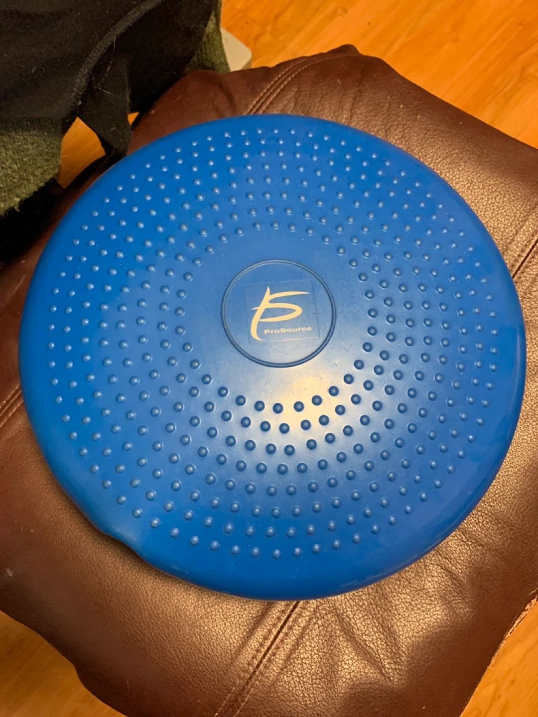 This is a blue ProSource balance disc. It's designed with small nubs on one side for added stimulation. Use it for core strengthening and improving posture.