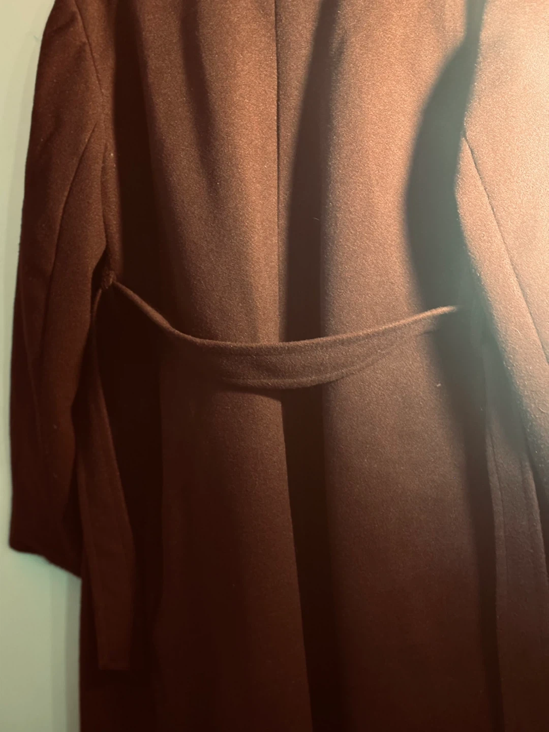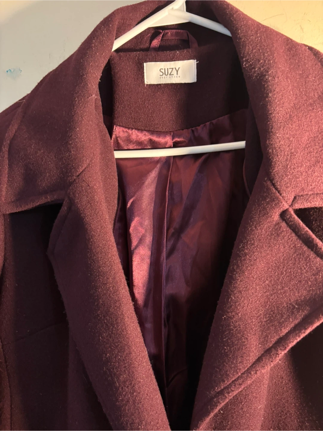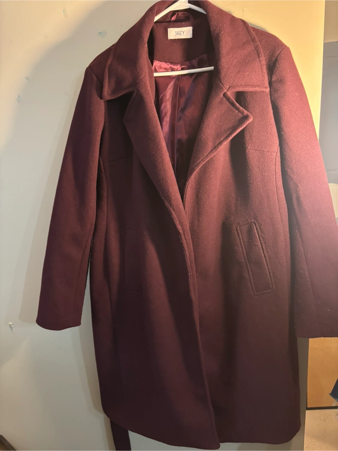 This is a stylish women's coat by Suzy Shier. It's a deep burgundy colour and made from a wool blend. The coat features a silky lining and a tie belt for a flattering fit. It's perfect for keeping warm during colder weather! Pick up in Terwillegar