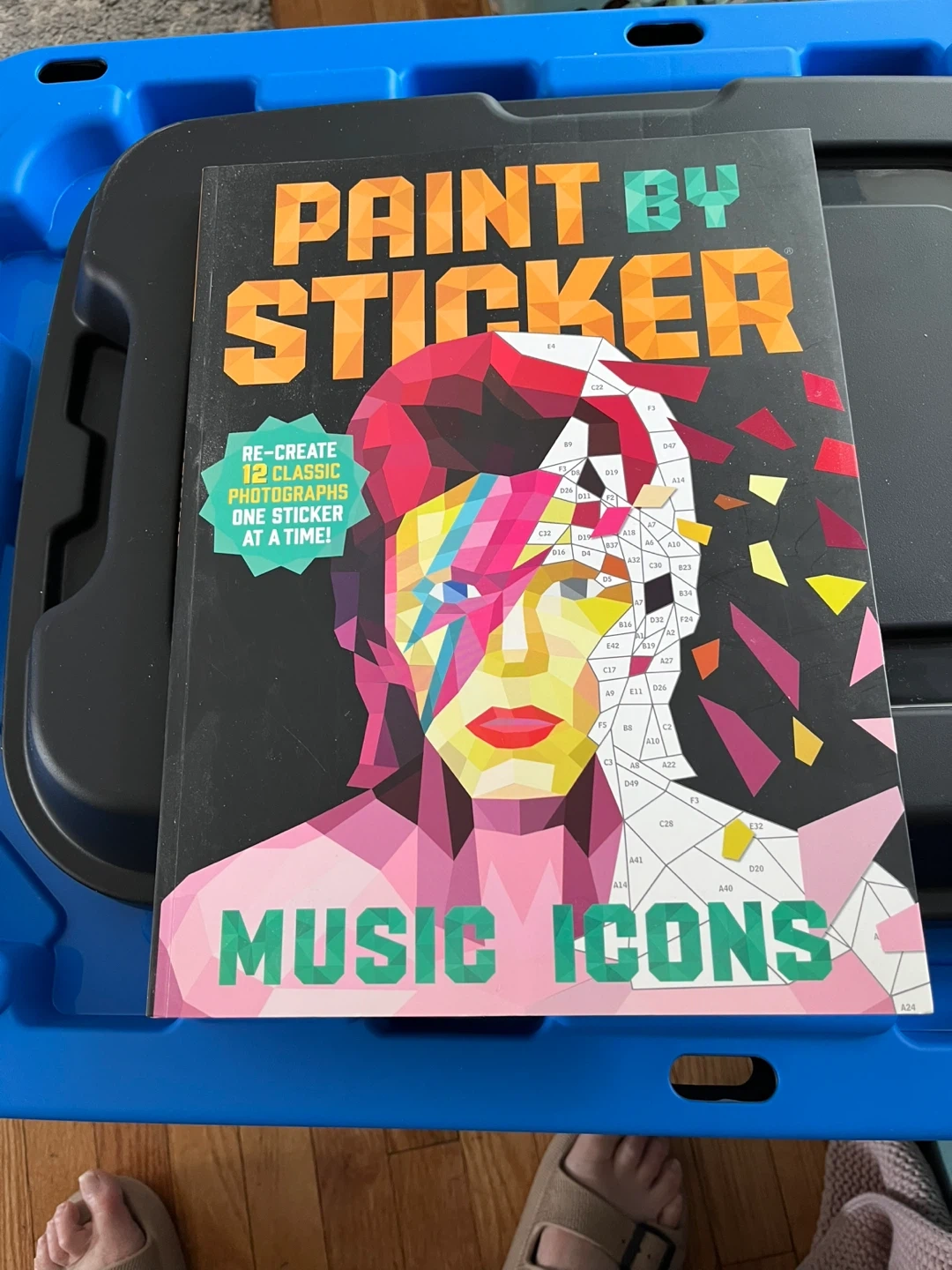 This book lets you re-create 12 classic music icons using stickers. It includes everything you need to complete the artwork. Get ready to make some cool portraits!