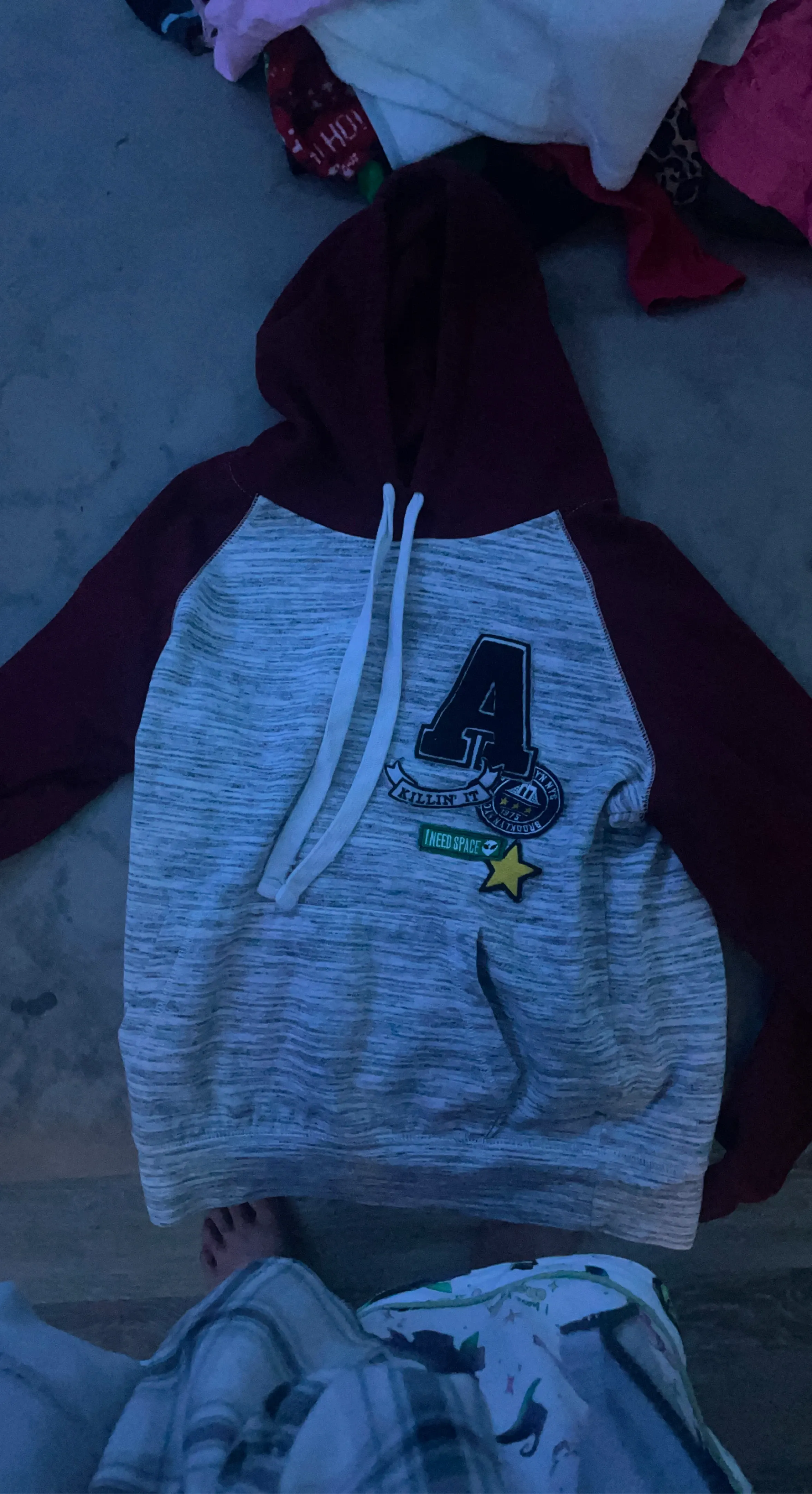 This hooded sweatshirt features a maroon body with grey raglan sleeves. It has an "A" patch with "KILLIN IT" and "BROOKLYN NYC 1975" details. There's also a small "I NEED SPACE" patch and a yellow star graphic. A kangaroo pocket is on the front.