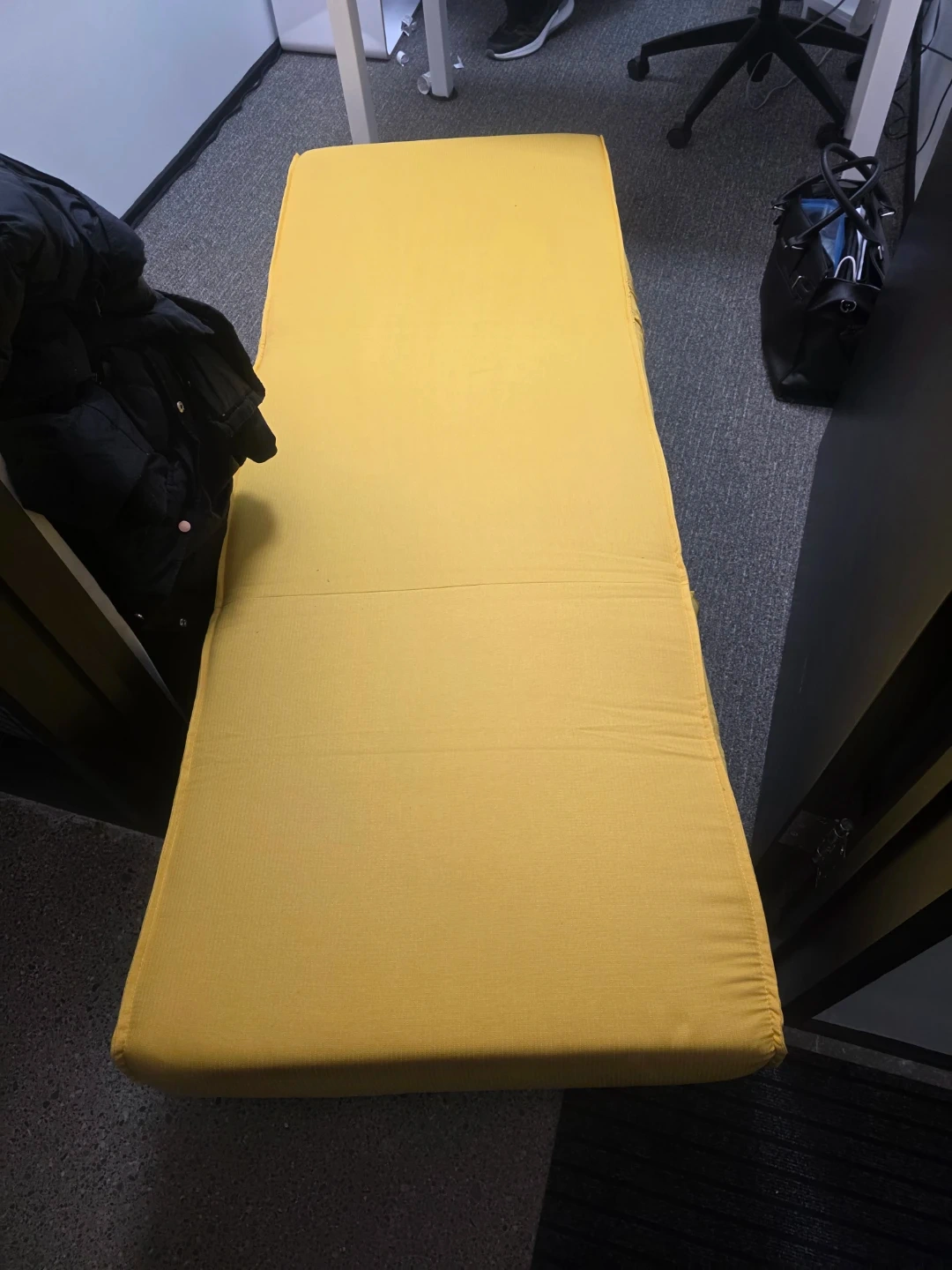 This is a yellow futon chair that converts into a bed. It comes with a small pillow. Great for small spaces or as an extra sleeping spot!