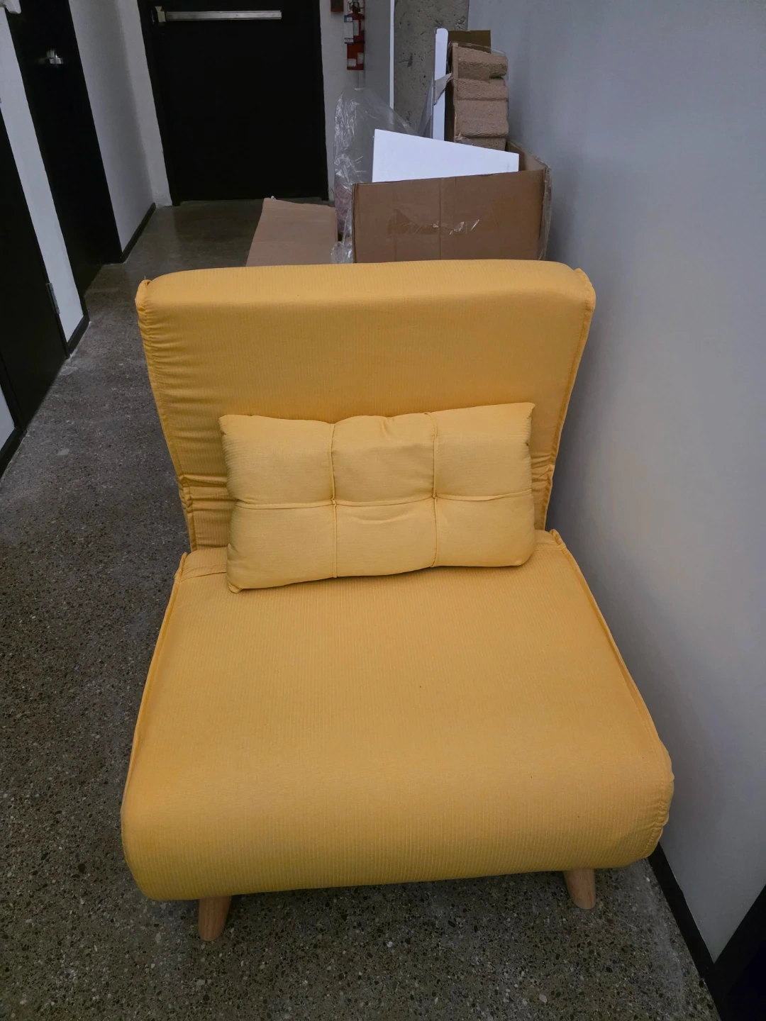 This is a yellow futon chair that converts into a bed. It comes with a small pillow. Great for small spaces or as an extra sleeping spot!