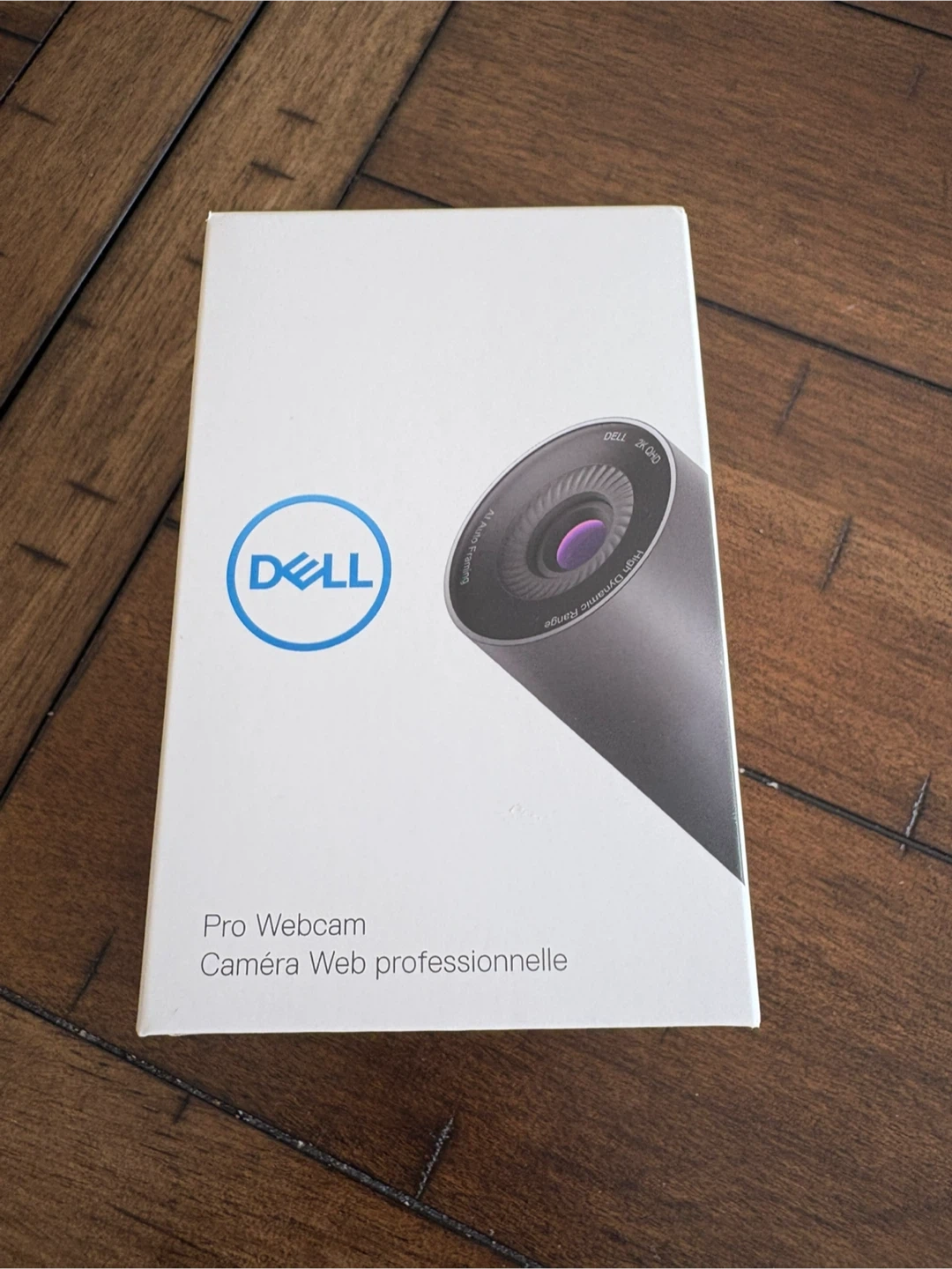 This is a Dell Pro Webcam with 2K QHD resolution. It features AI Auto Framing and High Dynamic Range. The webcam is imported and includes its original box. Manufacturing date is April 2025.