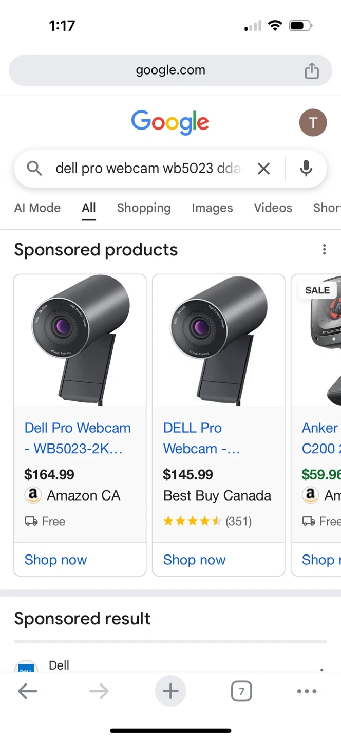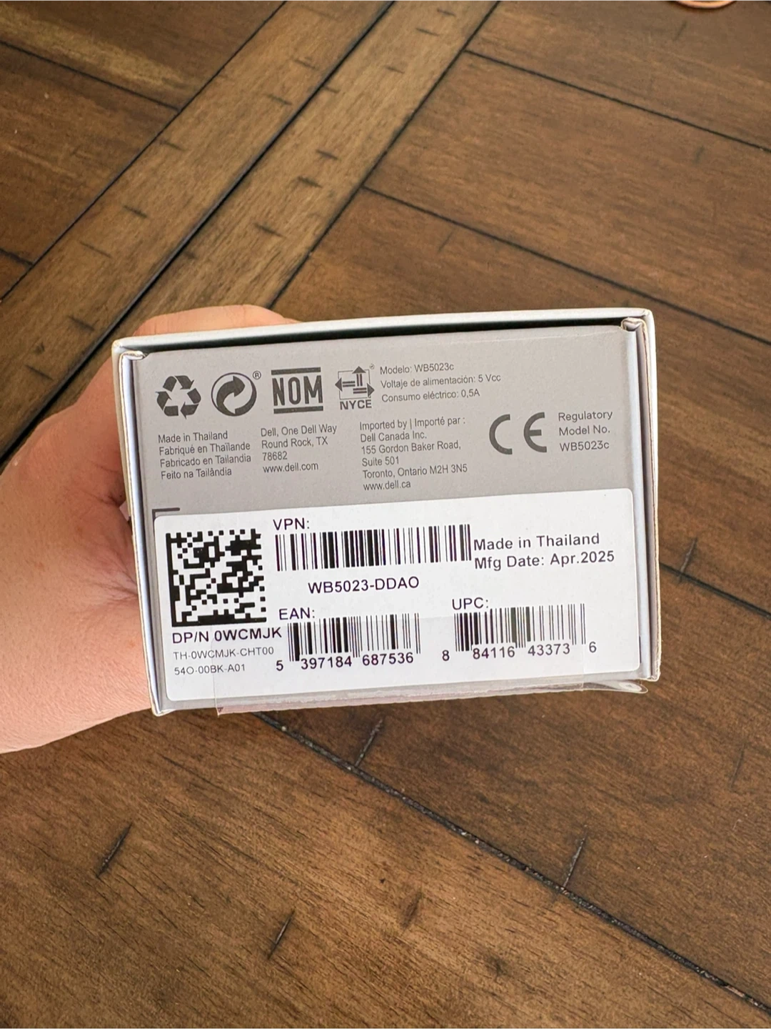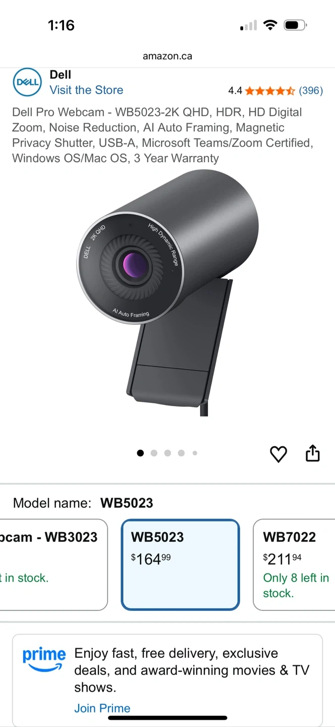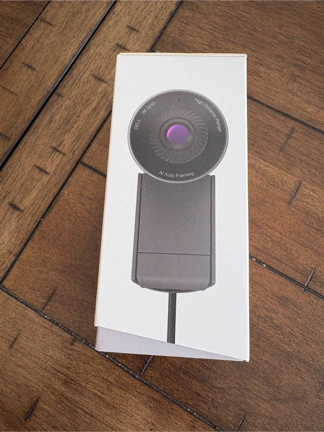 This is a Dell Pro Webcam with 2K QHD resolution. It features AI Auto Framing and High Dynamic Range. The webcam is imported and includes its original box. Manufacturing date is April 2025.