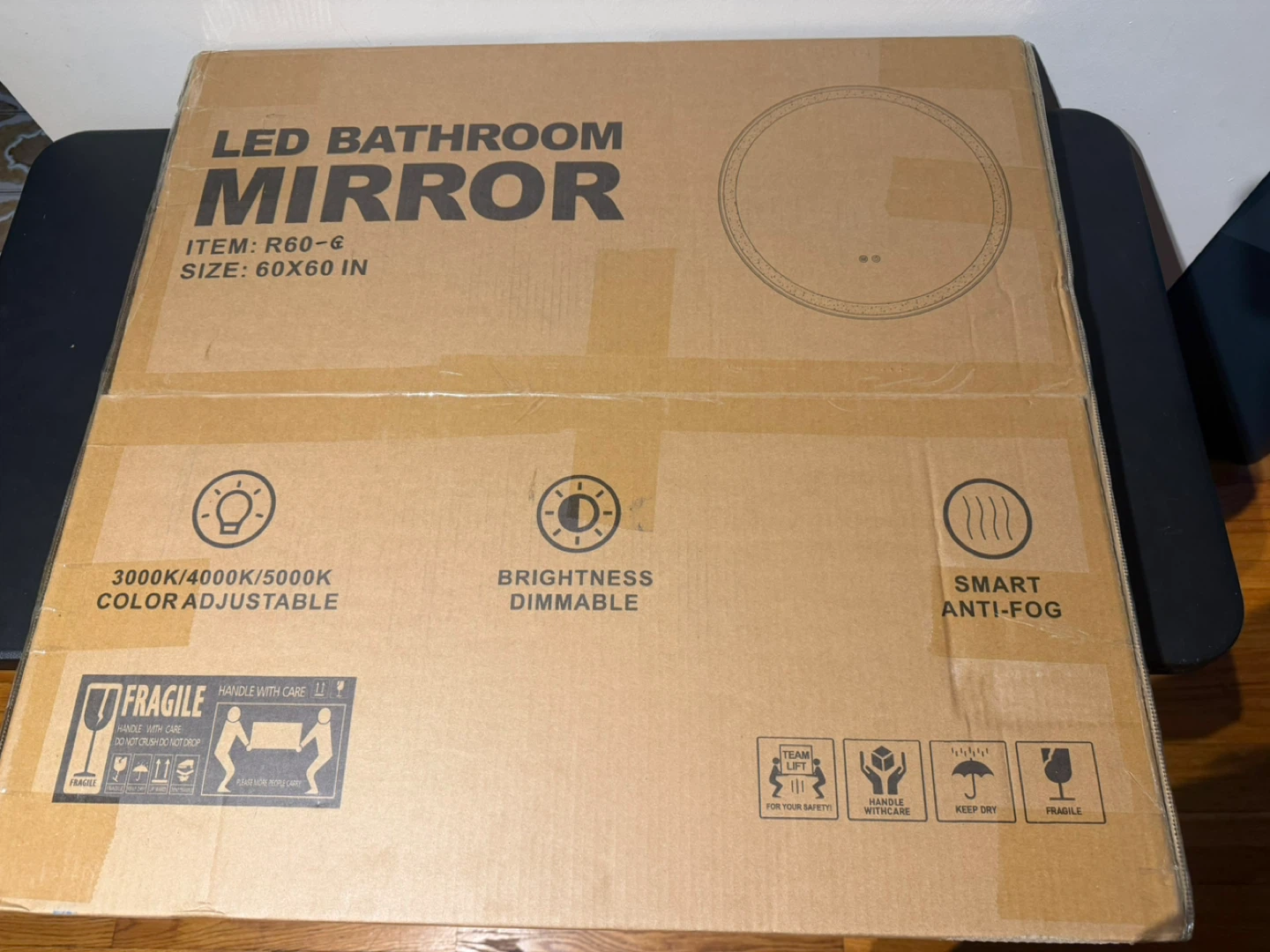 This LED bathroom mirror measures 60x60 inches. It features adjustable color temperature (3000K/4000K/5000K), dimmable brightness, and smart anti-fog capabilities. It's a great addition for any modern bathroom!