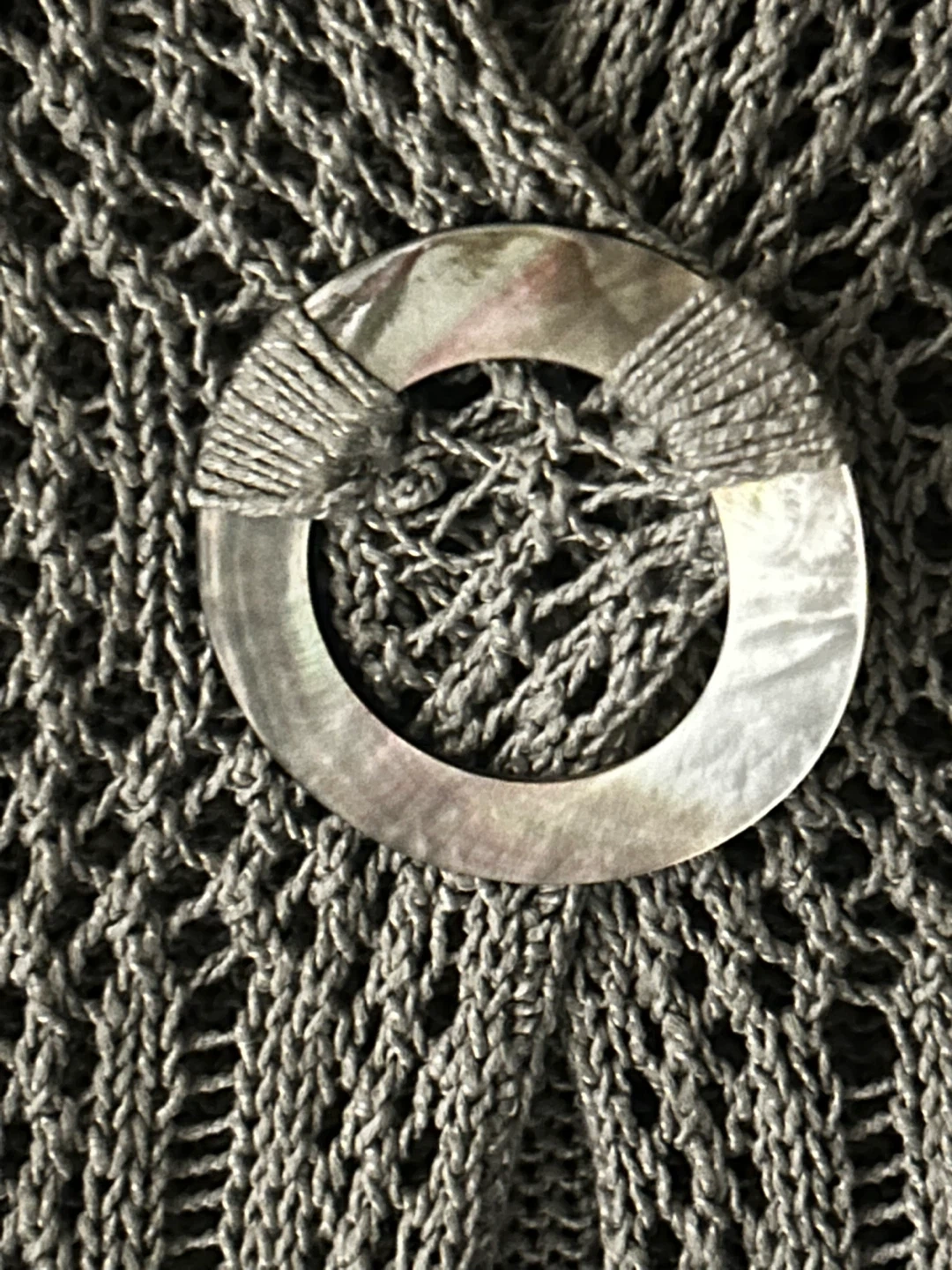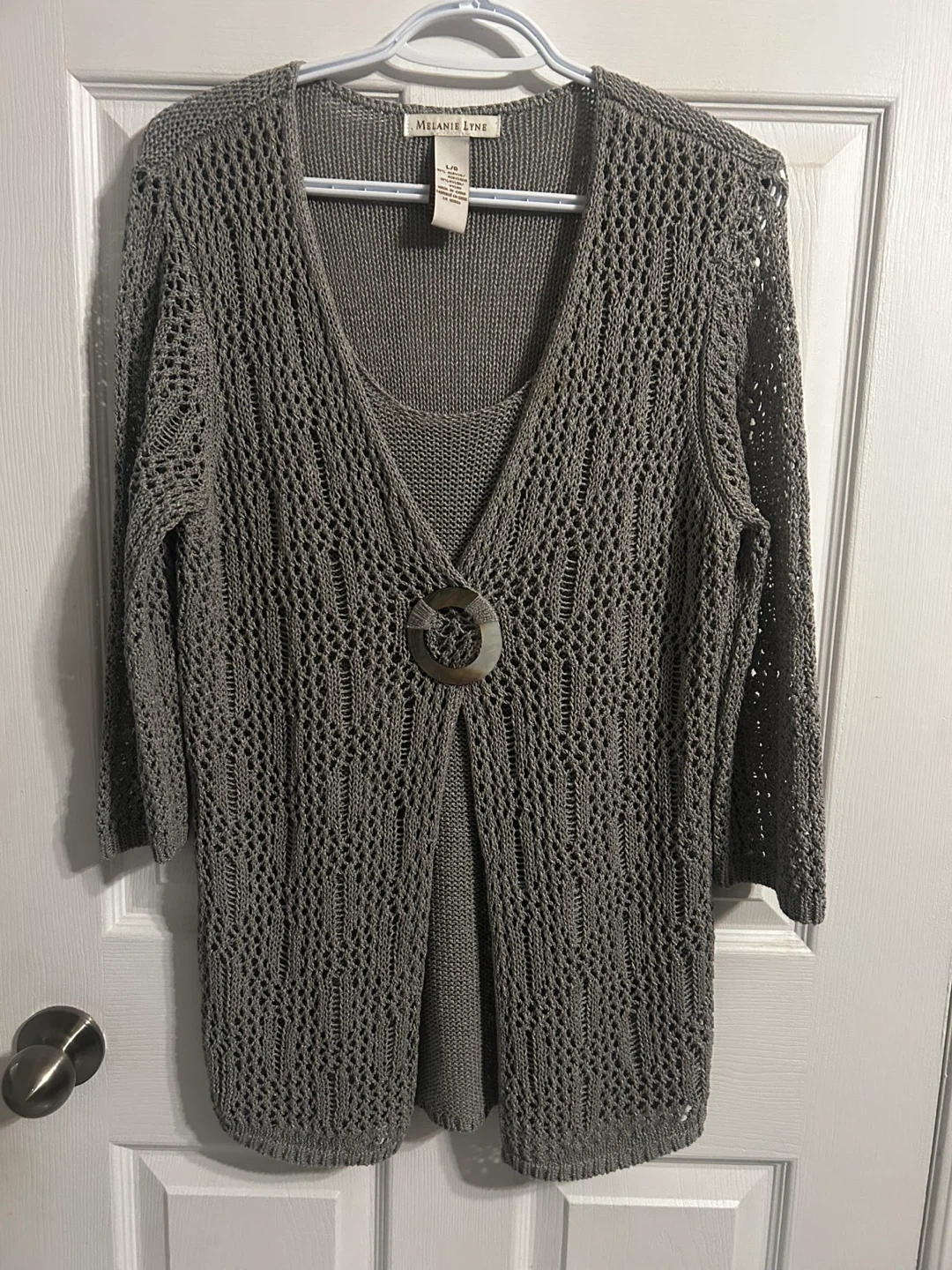 This is a Melanie Lyne women's knit cardigan sweater. It's a size L/G and made with 90% acrylic and 10% nylon. Features a decorative ring closure at the neckline.