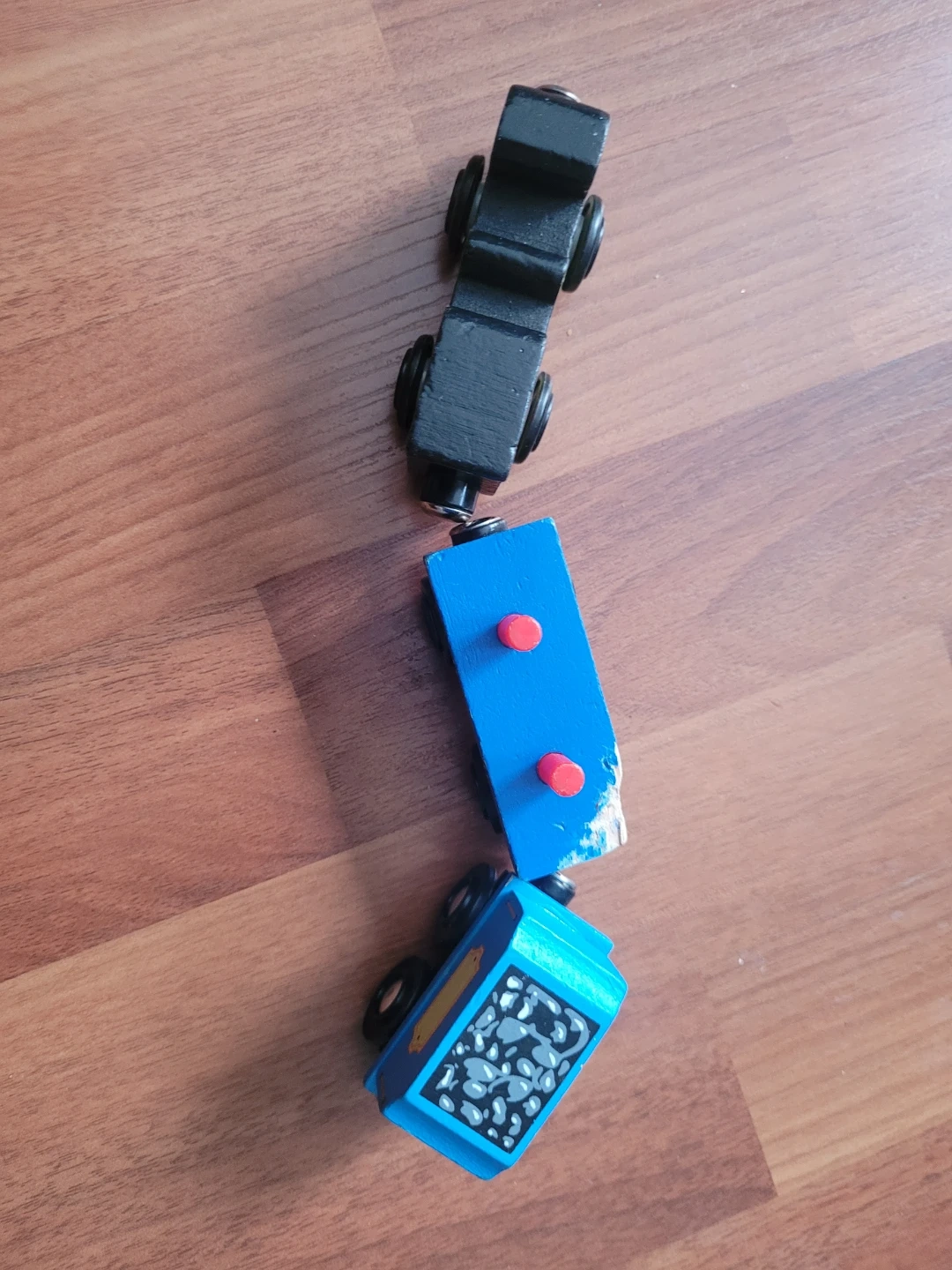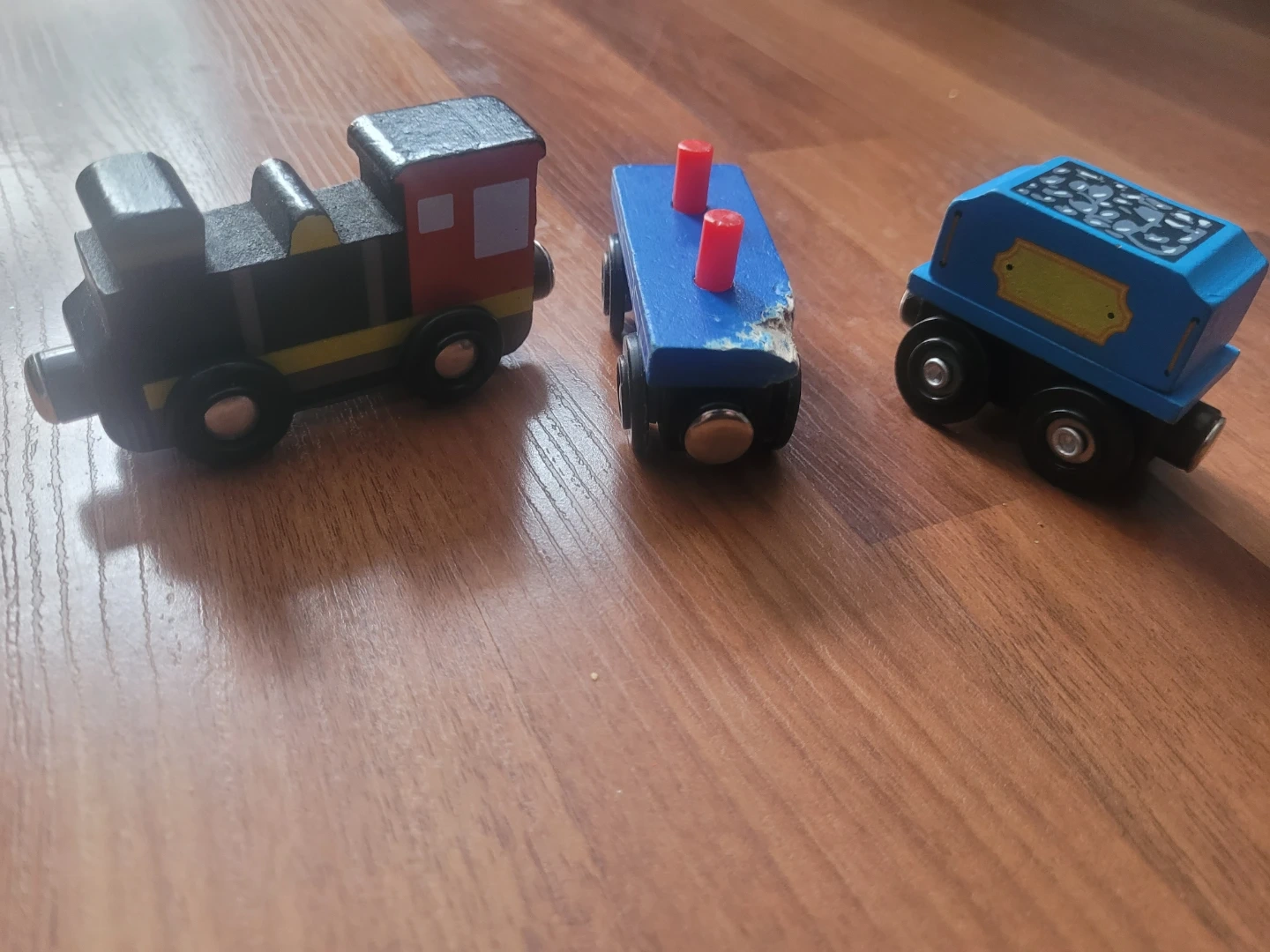I am selling a used Melissa & Doug wooden toy train set, perfect for toddlers and young children. The train cars easily connect with magnets. This set has been well-loved and shows signs of wear, which can be seen in the pictures. This adds to the charm of the toy, it's been played with and loved!