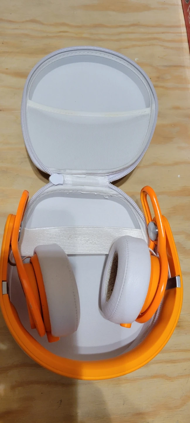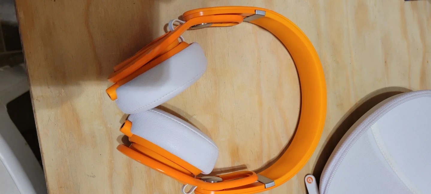 These are Beats Mixr on-ear headphones in a vibrant orange colour. They come with a protective carrying case. The headphones have white earcups. PENDING