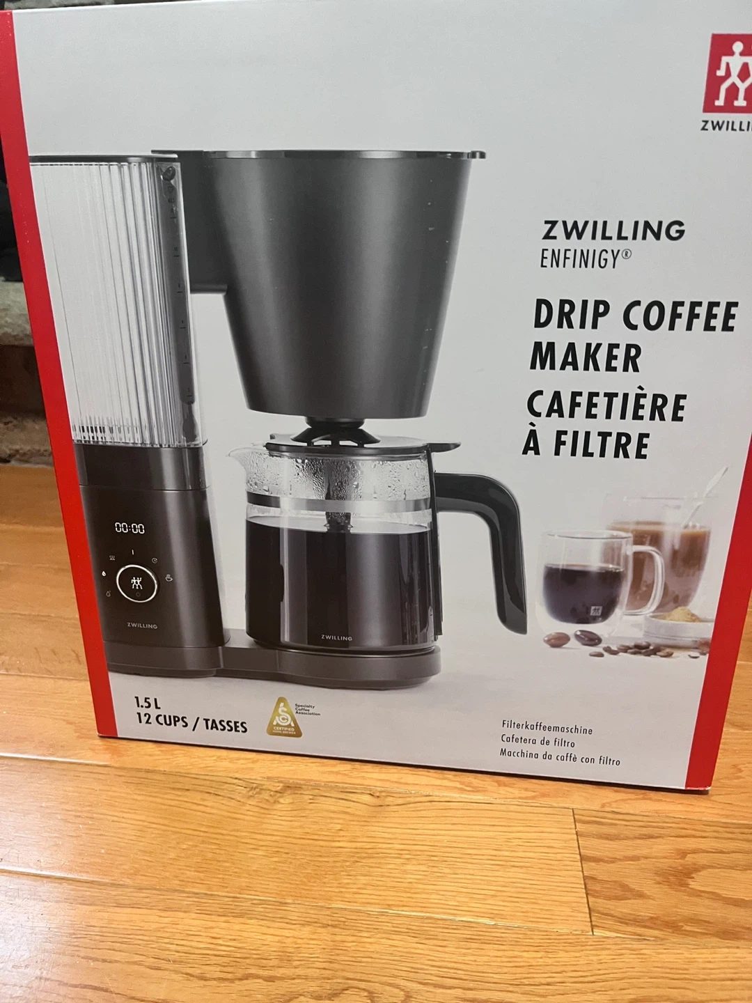 100% new !Zwilling Enfinigy drip coffee maker. Brews up to 1.5 litres or 12 cups. Includes carafe and filter basket.