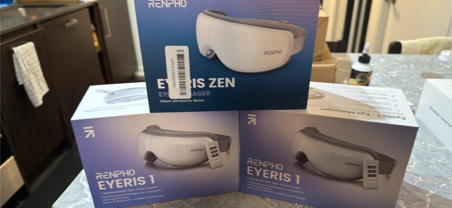 This RENPHO Eyeris1 eye massager offers heat, Bluetooth music, and multiple massage modes for eye relaxation. It features 2 heat and compression levels with touch buttons and a remote control. Includes original packaging.