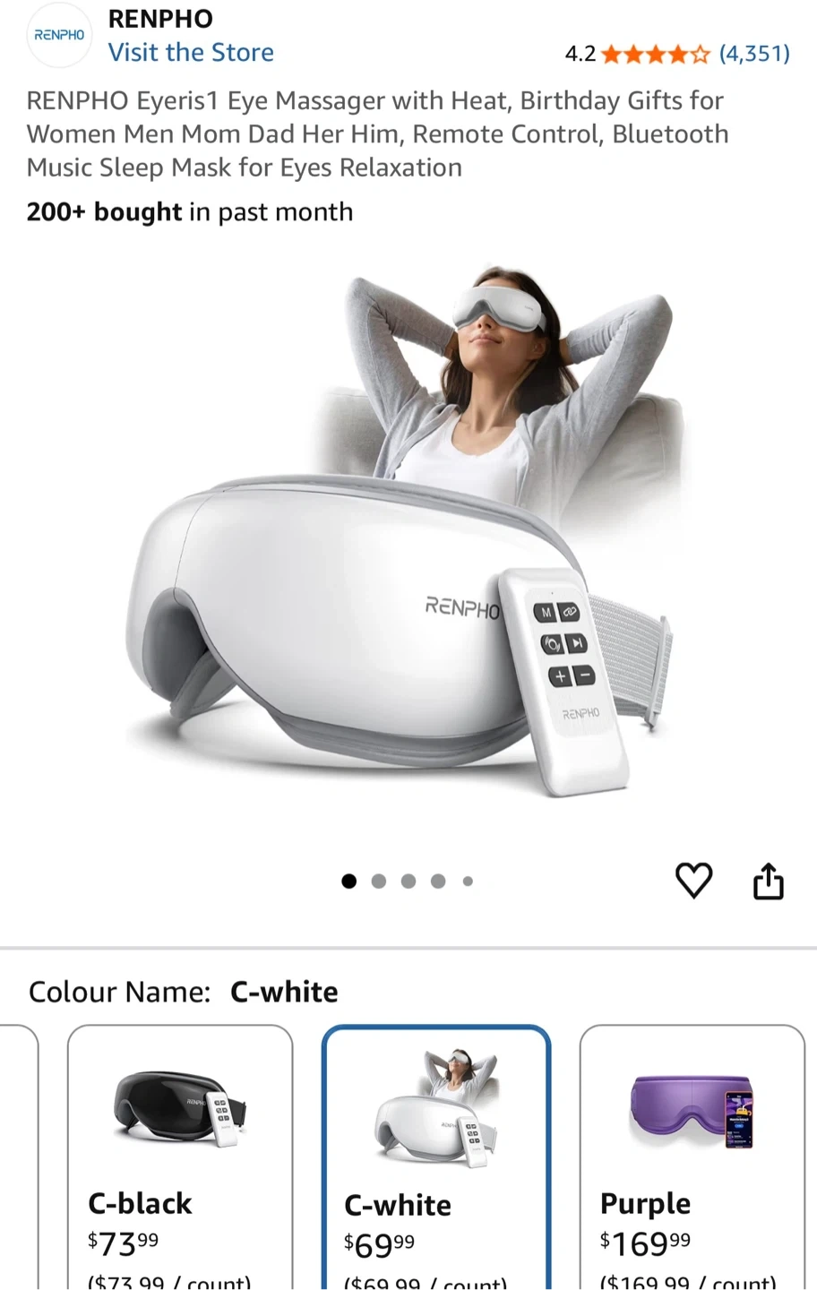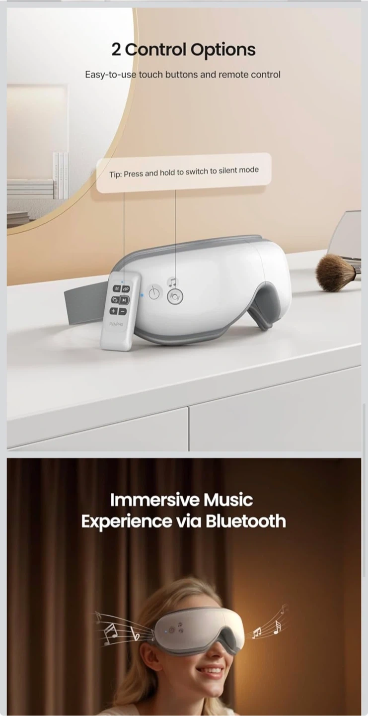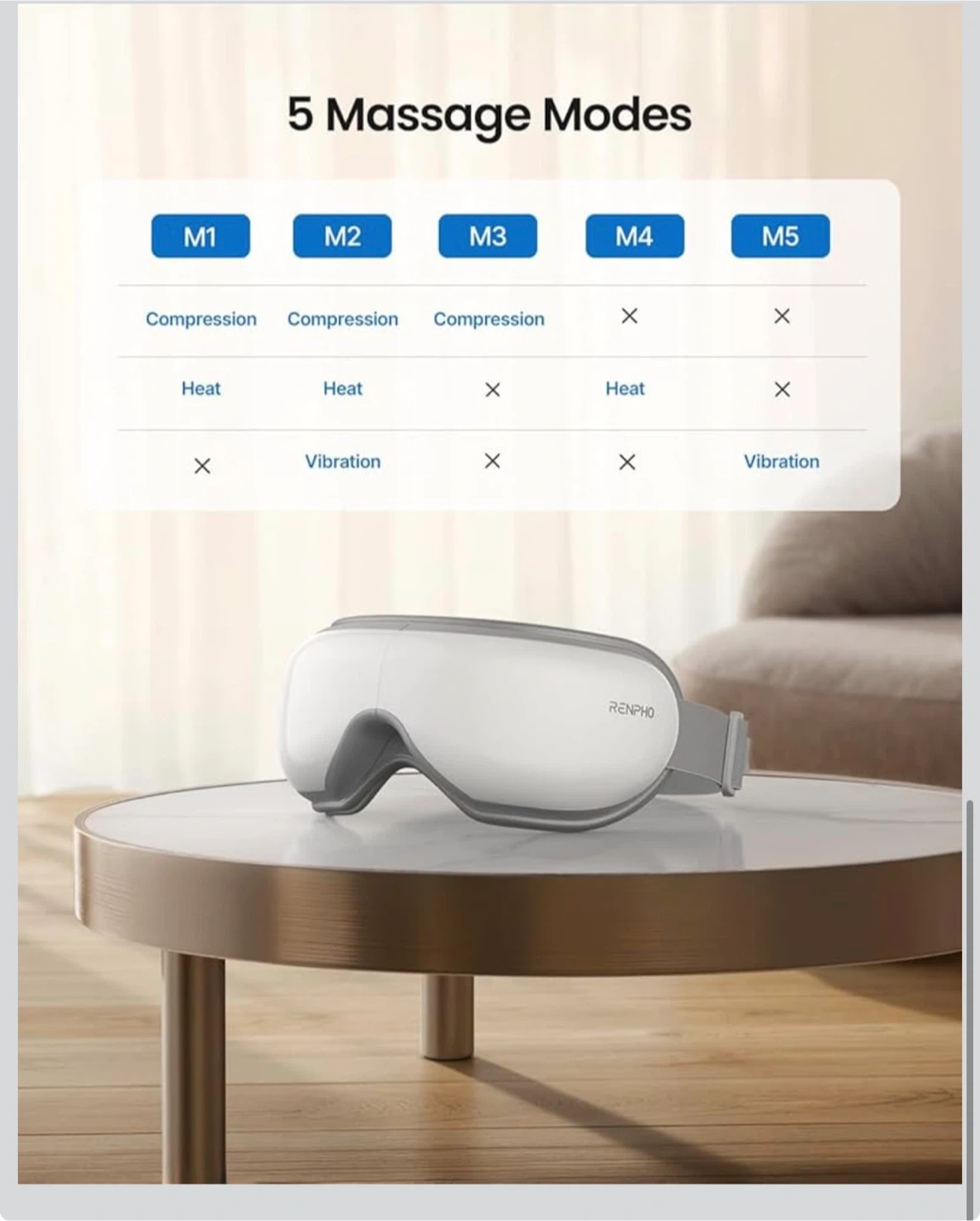 This RENPHO Eyeris1 eye massager offers heat, Bluetooth music, and multiple massage modes for eye relaxation. It features 2 heat and compression levels with touch buttons and a remote control. Includes original packaging.