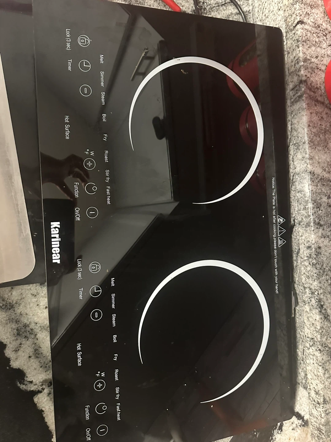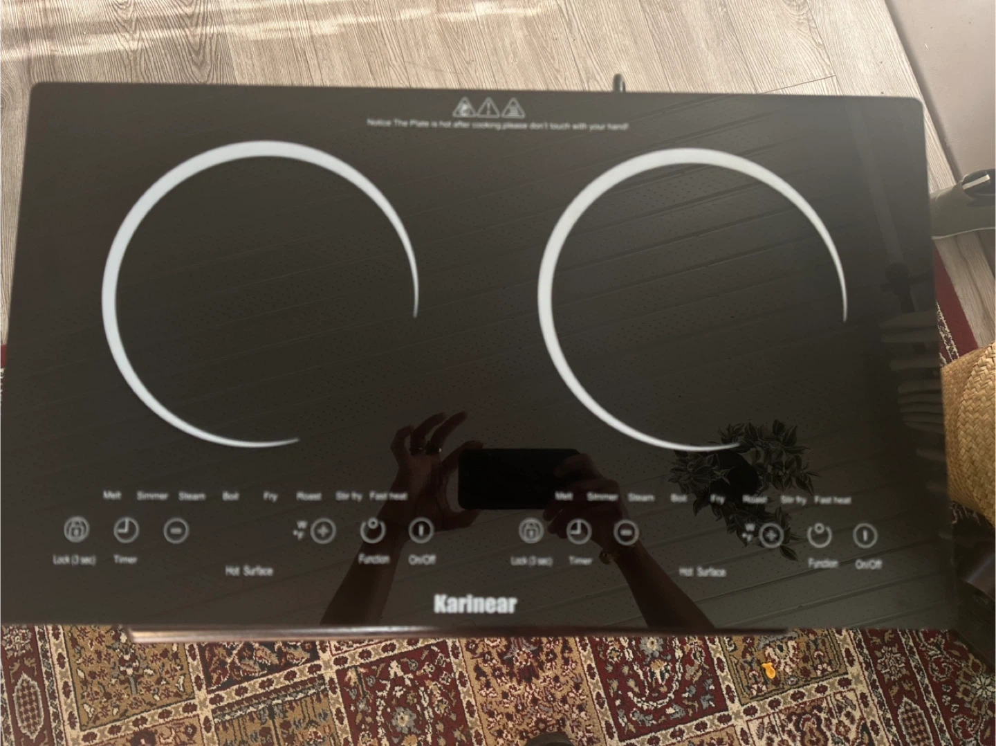 This Karinear electric cooktop features dual burners. It offers various cooking functions including Melt, Simmer, Steam, Boil, Fry, Roast, Stir-fry, and Fast Heat. The unit has a sleek black glass surface with touch controls. It's suitable for a variety of cooking needs in your kitchen.