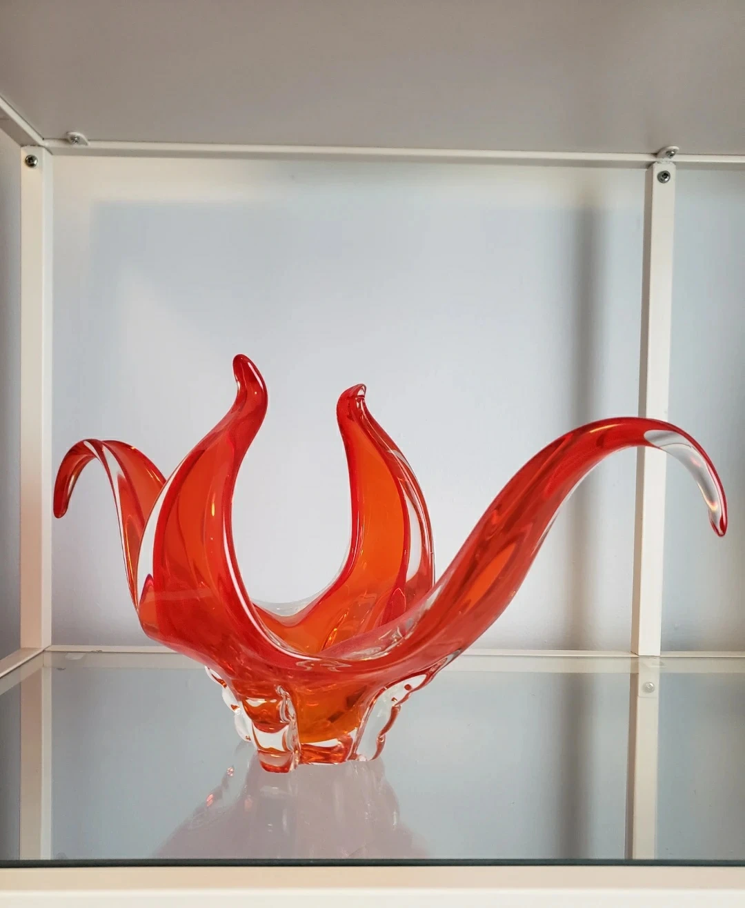 This is a striking orange glass art bowl. It features a unique, sculptural design with flared edges. It's made of vibrant orange glass.
