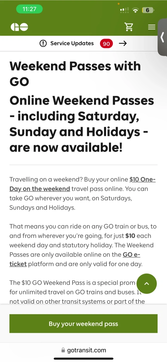 Online Weekend Passes including Saturday, Sunday, and Holidays are now available! Get unlimited travel on GO trains and buses for just $10 each weekend day and statutory holiday. Passes are only valid for one day and available on the GO e-ticket platform.