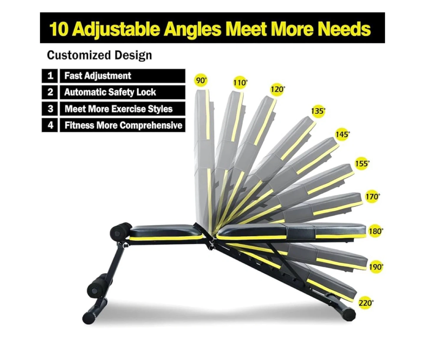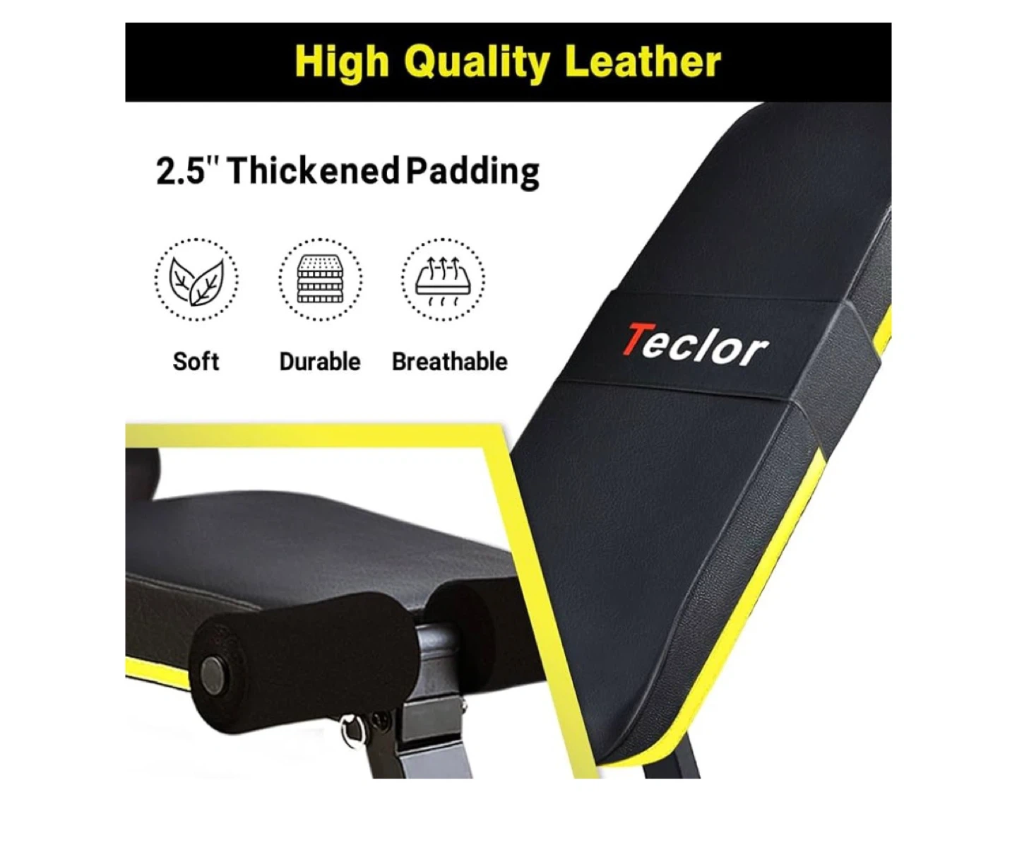 This Teclor adjustable weight bench offers 10 different angles to suit your workout needs. It's made with high-quality leather and 2.5" thickened padding for comfort. Foldable design saves space when not in use.