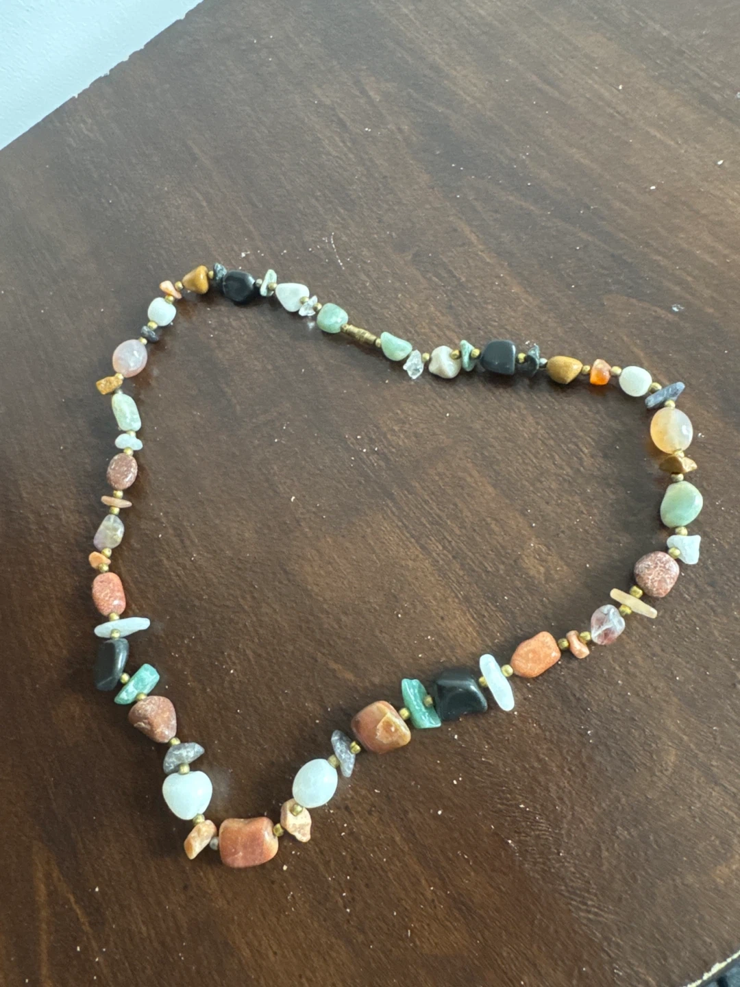 This necklace features a colourful assortment of small, tumbled gemstones. Beads are strung on a thin cord with small gold-toned spacers between each stone. It's a unique piece with varied natural stones.