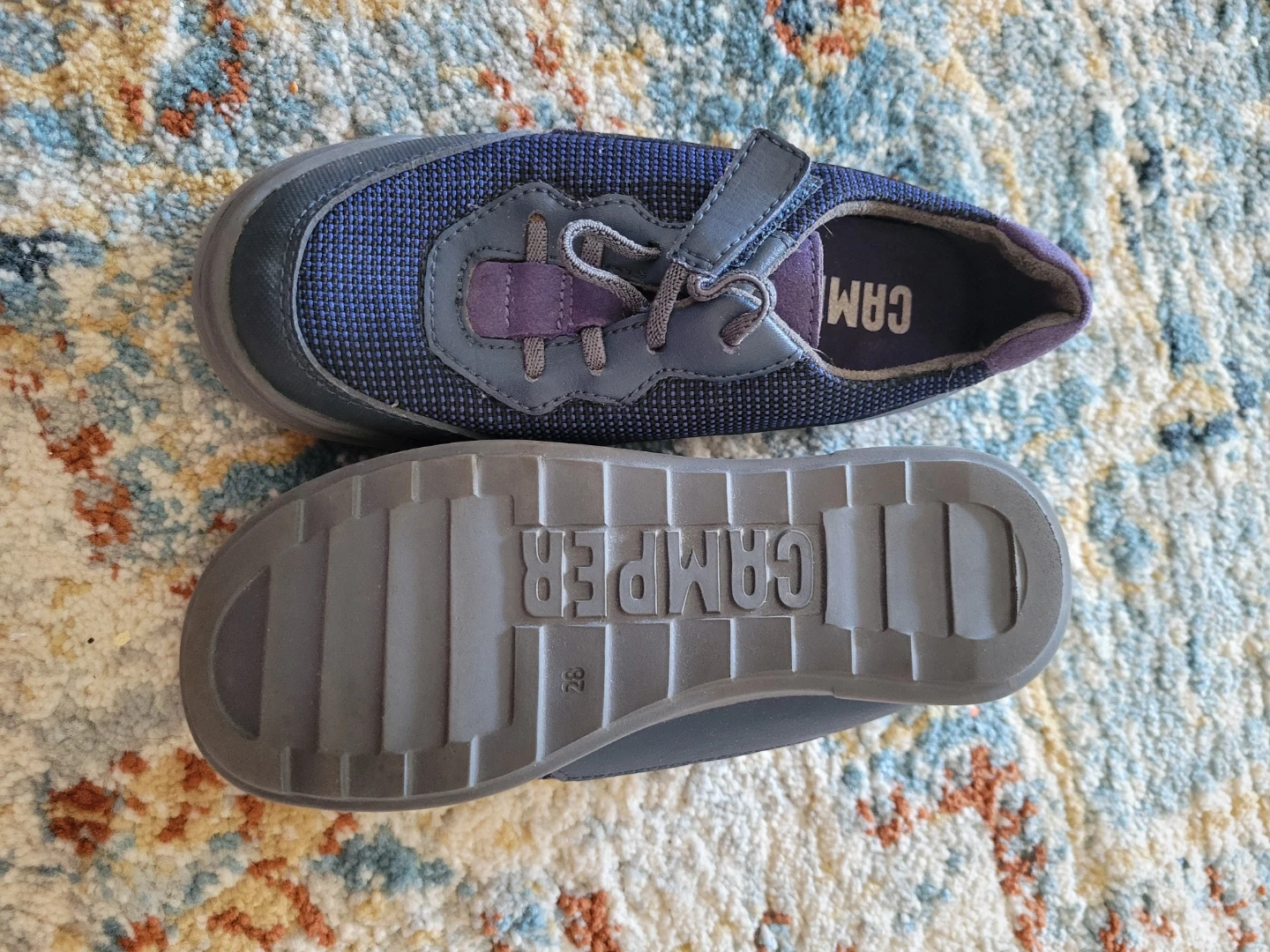 A pair of Camper kids' shoes in navy blue and purple. Features a hook-and-loop strap and laces. Made with a textile and synthetic upper and a rubber sole. Size 28