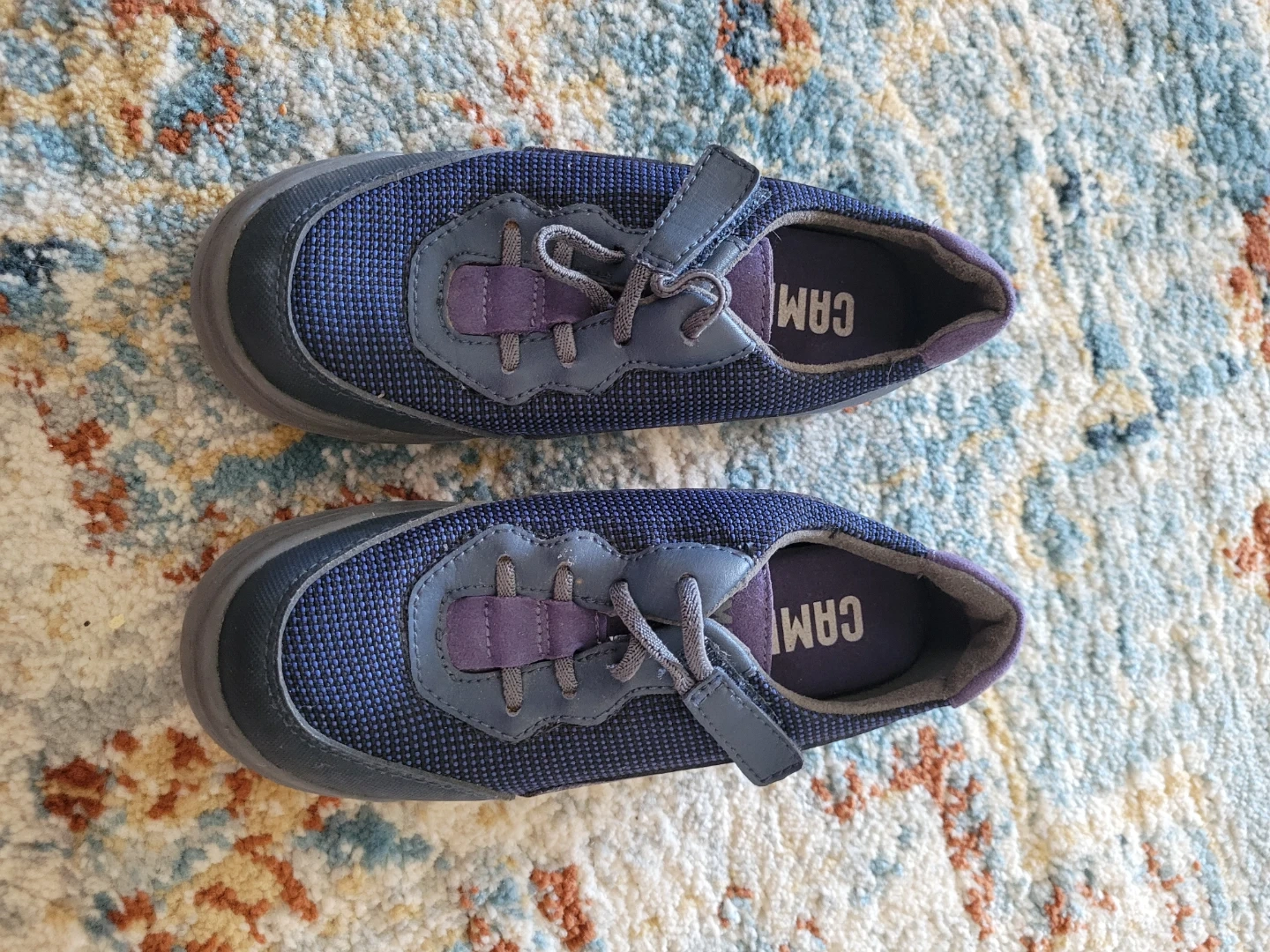 A pair of Camper kids' shoes in navy blue and purple. Features a hook-and-loop strap and laces. Made with a textile and synthetic upper and a rubber sole. Size 28