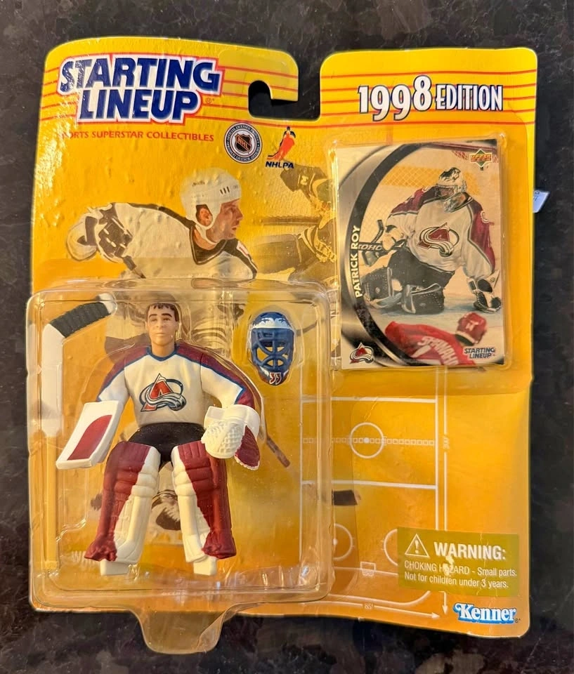 For sale is a 1998 Starting Lineup NHL collectible figure featuring Patrick Roy with the Colorado Avalanche. It includes the original packaging and the collectible card, which is still sealed. This is a great piece for any hockey collector or fan of one of the greatest goalies ever. Made by Kenner and officially licensed by the NHL/NHLPA.